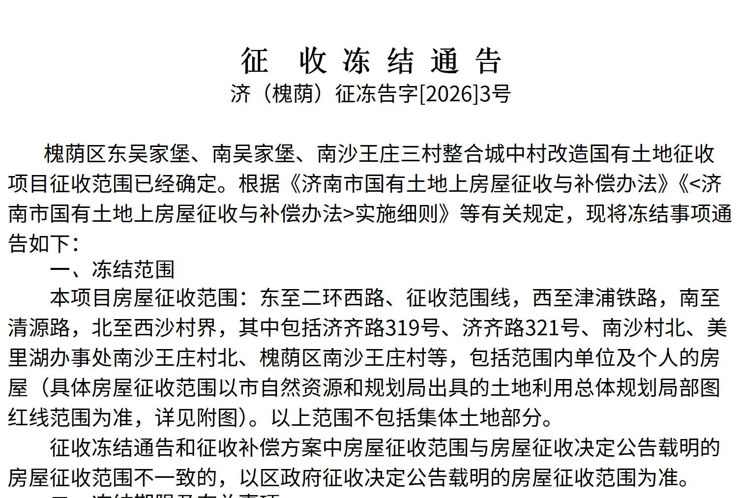 近日,济南市槐荫区住房和城乡建设局发布征收冻结通告,槐荫区东吴家堡、南吴家堡、南沙王庄三村整合城中村改造国有土地征收项目征收范围已经确定。