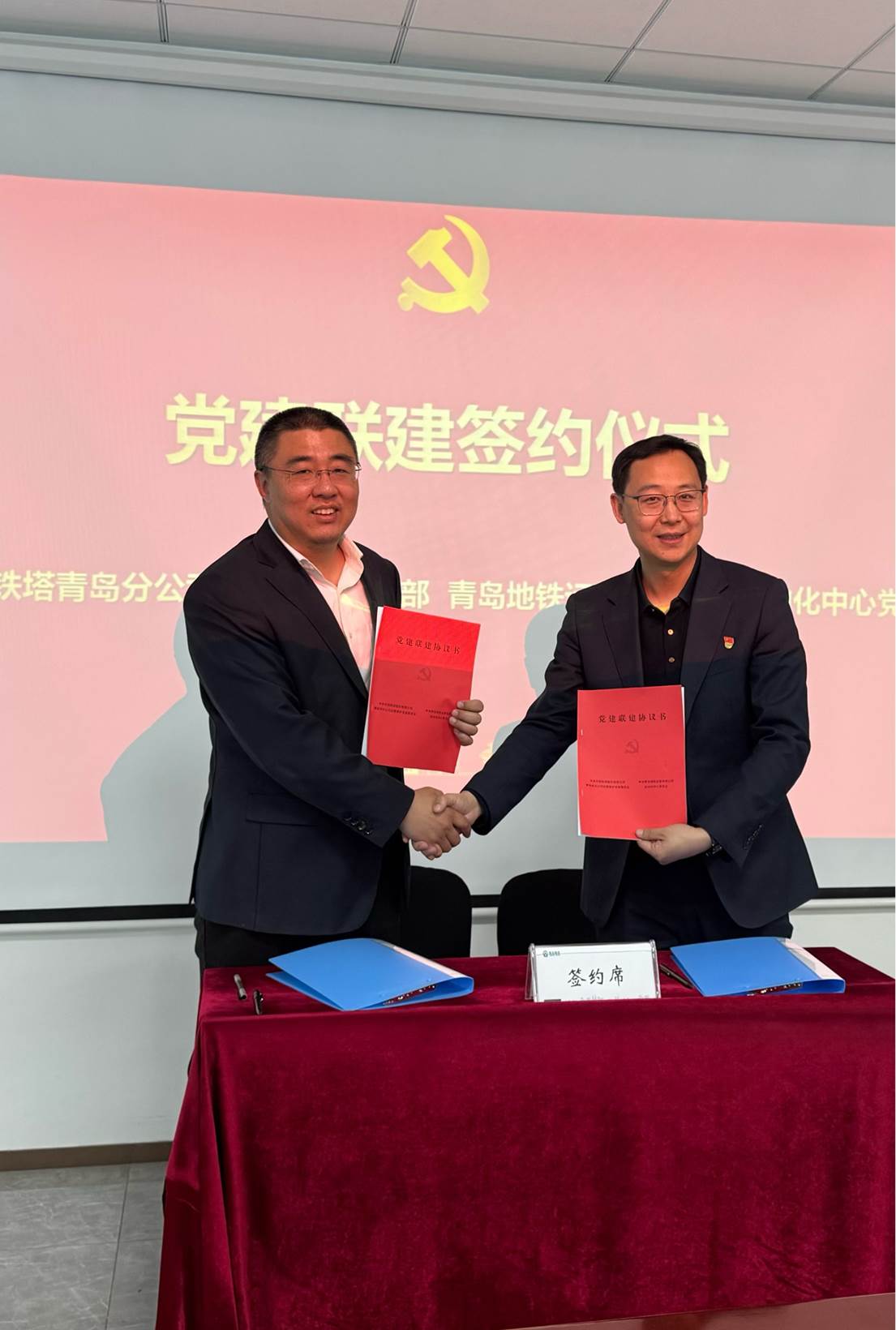 参观结束后,双方举行党建联建协议书签署仪式,青岛地铁运营有限公司自动化中心党委书记、总经理李亚东与青岛铁塔运营维护部党支部书记、总经理王超共同签署协议,正式确立结对共建关系。随后,双方聚焦民用通信保障需求及未来合作模式开展座谈交流,明确以“资源共享、组织共建、发展共鸣、合作共赢”为原则,依托党建联建平台,在5G新基建、通信保障、技术创新等领域开展全方位合作。