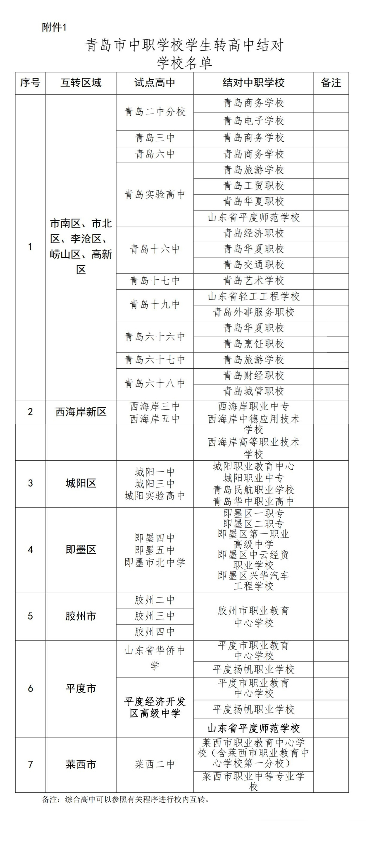 青岛市普职互转根据全市高中招生范围划分为7个区域,其中市南区、市北区、李沧区、崂山区、高新区作为一个区域,由青岛市教育局负责组织;西海岸新区、城阳区、即墨区、胶州市、平度市、莱西市6个区(市)各自为1个区域,由各区(市)教育行政部门负责组织。