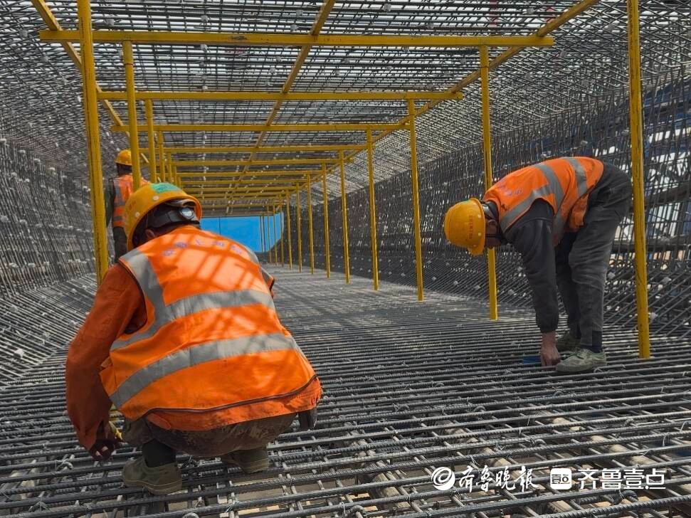 在烟台南站站房建设工地,机器轰鸣、焊花飞溅,上百名建设者正紧张有序地忙碌着。当前工程主攻旅客地道顶棚的钢筋绑扎,已进入收尾阶段,即将开展混凝土浇筑与土方回填,为后续高架候车室建设筑牢基础。