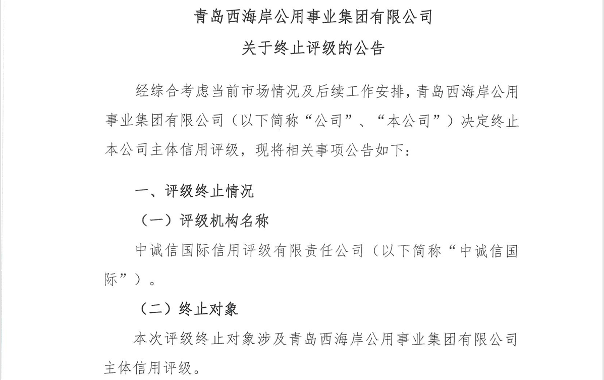 3月31日,青岛西海岸公用事业集团有限公司(下称“青岛西海岸公用事业集团”)公告称,经综合考虑当前市场情况及后续工作安排,公司决定终止中诚信国际信用评级有限责任公司(下称“中诚信国际”)对公司主体信用评级。