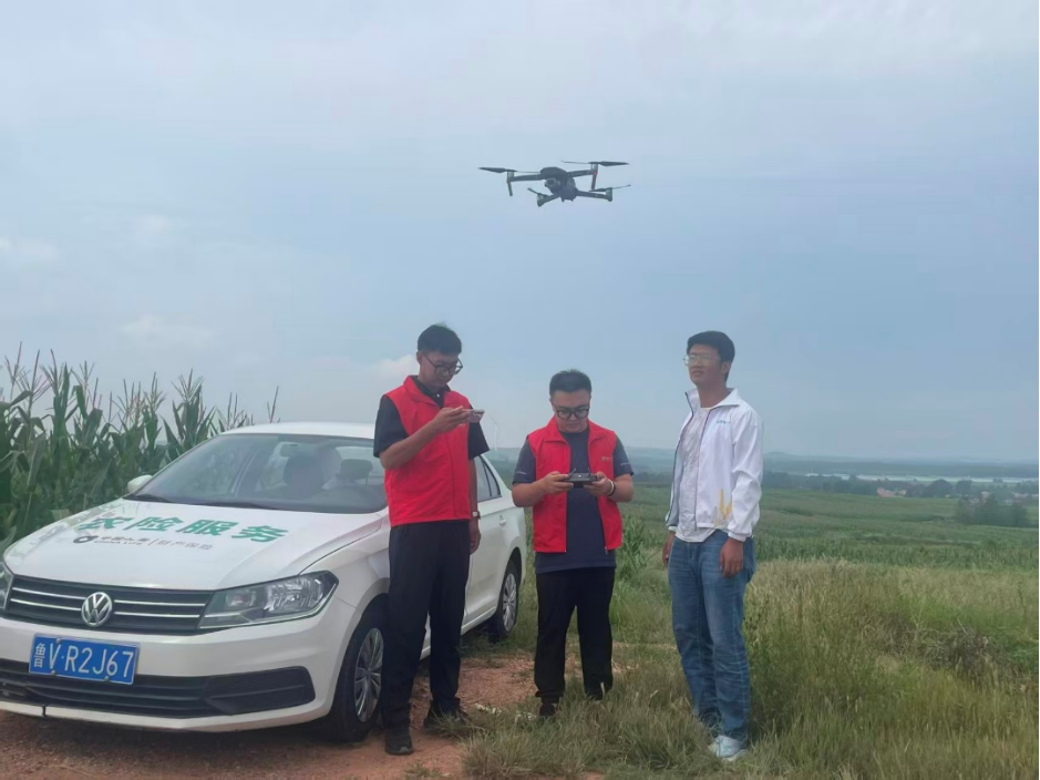 中国人寿财险山东省潍坊市中心支公司理赔人员利用无人机技术对受灾的玉米进行现场查勘。