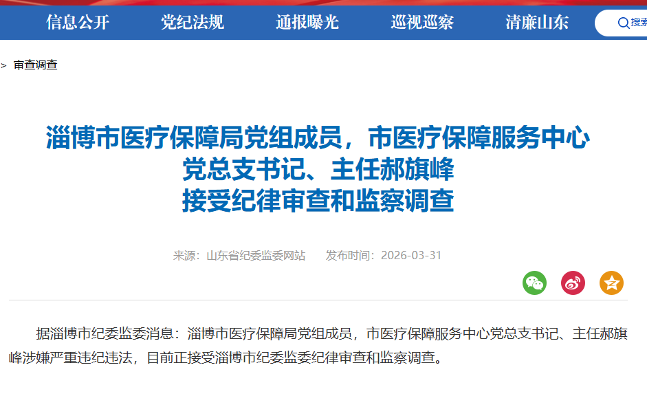 淄博市医疗保障局党组成员,市医疗保障服务中心党总支书记、主任郝旗峰被查打虎拍蝇猎狐 | 2026-03-31 18:21:44 微信扫码扫码下载客户端据淄博市纪委监委消息:淄博市医疗保障局党组成员,市医疗保障服务中心党总支书记、主任郝旗峰涉嫌严重违纪违法,目前正接受淄博市纪委监委纪律审查和监察调查。责任编辑:陈修华