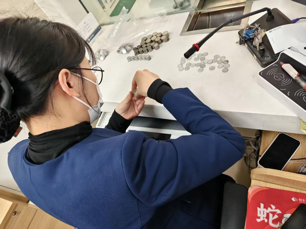 近日,一位经营超市的个体工商户来到恒丰银行潍坊分行营业部,由于日常营收积累了大量一角面值的硬币,客户在年底整理出多达3000枚,希望存入银行。面对数量庞大、清点繁琐的零币,营业部迅速响应,立即开通绿色通道。六名柜员主动放弃午休时间,分工协作,对硬币进行细致分拣与逐枚核验。经过一个多小时的努力,所有硬币被准确清点并顺利存入账户。高效贴心的服务,赢得了客户的连连称赞。