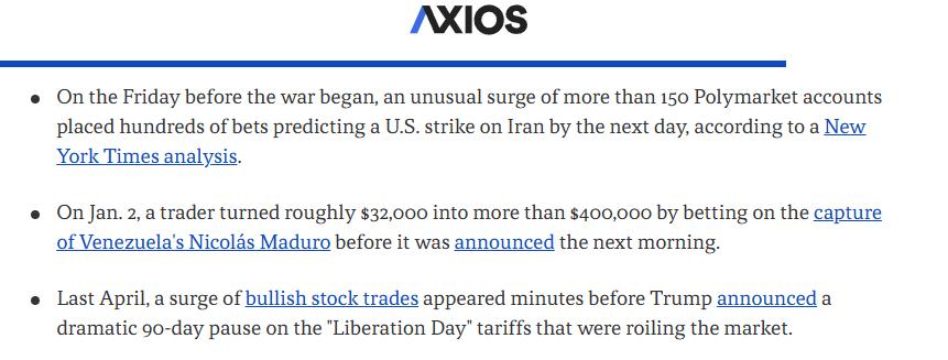 《华尔街日报》梳理发现,本届美国政府上任以来,从关税政策急转弯,到针对委内瑞拉、伊朗的军事行动,再到总统表态引发的市场剧烈波动,几乎每逢重大消息落地前,市场上都会出现时间点极其精准的异常交易。