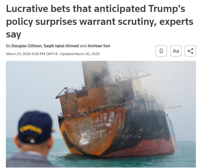 路透社在回顾本届美国政府上任以来多次重大政策转向时指出,这些交易的时间点和规模都“值得审查”,因为这可能意味着,有人在公开消息发布前就已掌握政府内部信息。