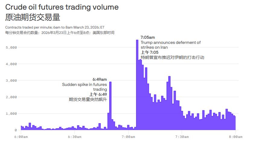 3月23日,美国总统特朗普在社交平台发文称,将推迟对伊朗电力设施的打击。消息发布后,油价迅速下跌,股指期货走高。但《华尔街日报》指出,就在这条帖文发布前约15分钟,原油期货和标普500期货市场突然异常放量:美东时间上午6:49至6:51的短短两分钟内,布伦特原油和西得克萨斯中质原油期货的成交额超过7.6亿美元,而当时并无公开消息能解释这一异动。