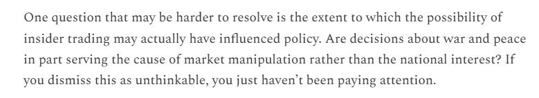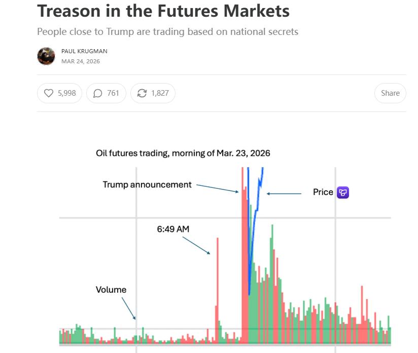 克鲁格曼进一步提出一个令人不安的问题:内幕交易获利的可能性,是否反过来影响了政策本身?换句话说,战争与和平的决策,是否正在部分沦为市场操纵的工具,而不是服务于国家利益?