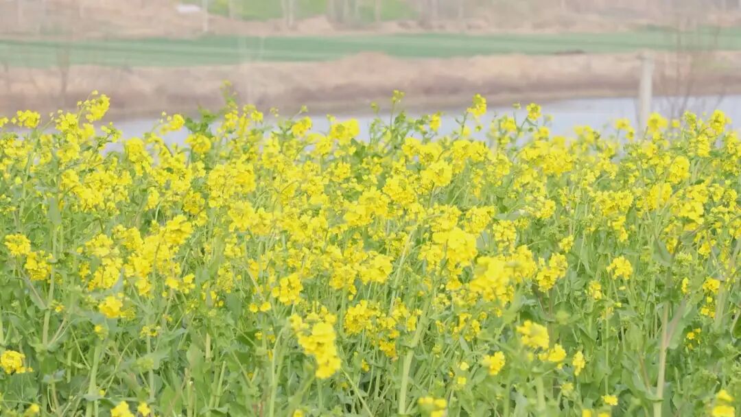 连片的油菜花沿着河岸肆意绽放