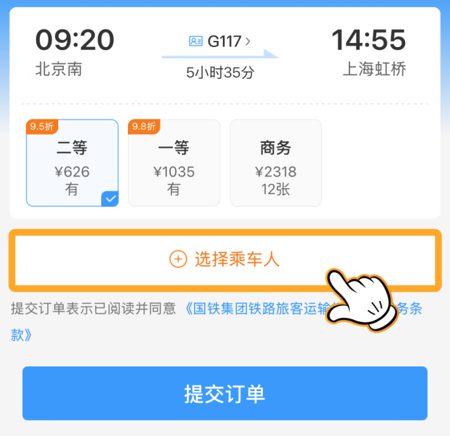 完成乘车人信息添加后,选定车次进入预订页面。勾选已添加的儿童信息,支付后即可完成购票。