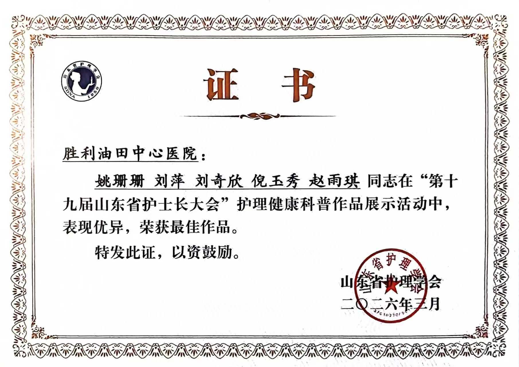 大会设置“科普惠健康”护理健康科普作品展示、“话案例 共分享,讲我所做 做我所讲”临床护理典型案例分享展示等特色板块。胜利油田中心医院护理团队凭借扎实的专业素养与创新的护理实践,在大会特色活动中脱颖而出,荣获多项佳绩。其中,烧伤整形美容外科护理团队的健康科普作品《科学防肥胖 少年更健康》在全省65项参赛作品中斩获“最佳作品奖”;血液净化中心护理团队的启示性案例《从“成功”中“觉醒”》、肾内科护理团队的借鉴性案例《8年透析长河,一次心跳突围》,分别在全省145项启示性案例、186项借鉴性案例的参赛作品中荣获“最佳案例奖”,充分展现了该院护理团队的卓越实力与创新风采。