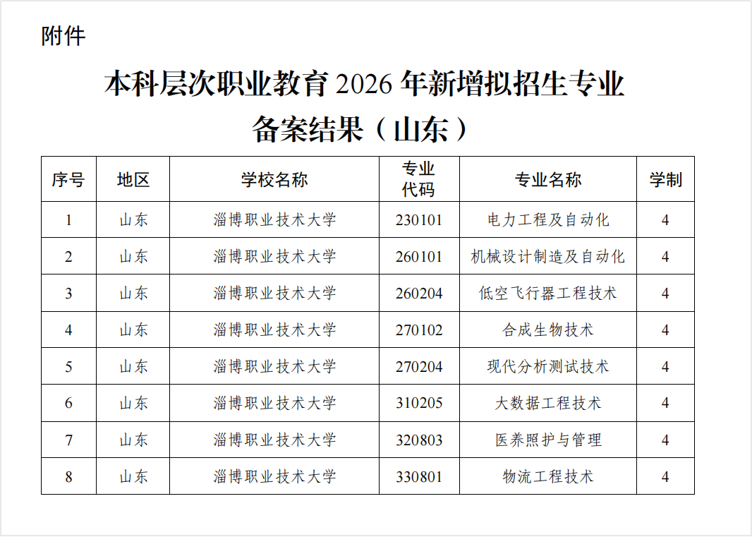近日,教育部办公厅公布2026年本科层次职业教育专业设置备案结果,淄博职业技术大学申报的电力工程及自动化、机械设计制造及自动化、低空飞行器工程技术、合成生物技术、现代分析测试技术、大数据工程技术、医养照护与管理、物流工程技术等8个四年制职业本科专业获批。