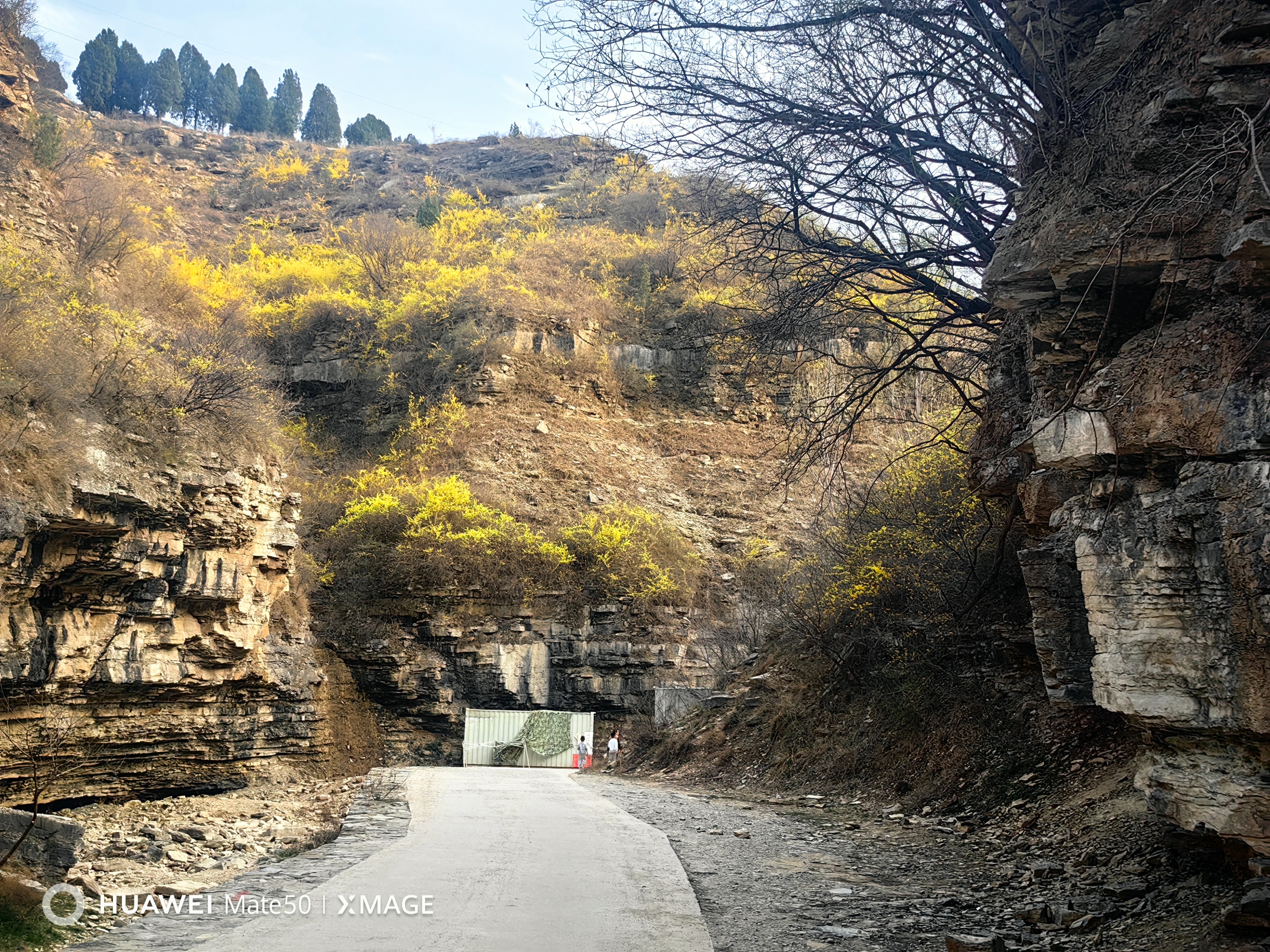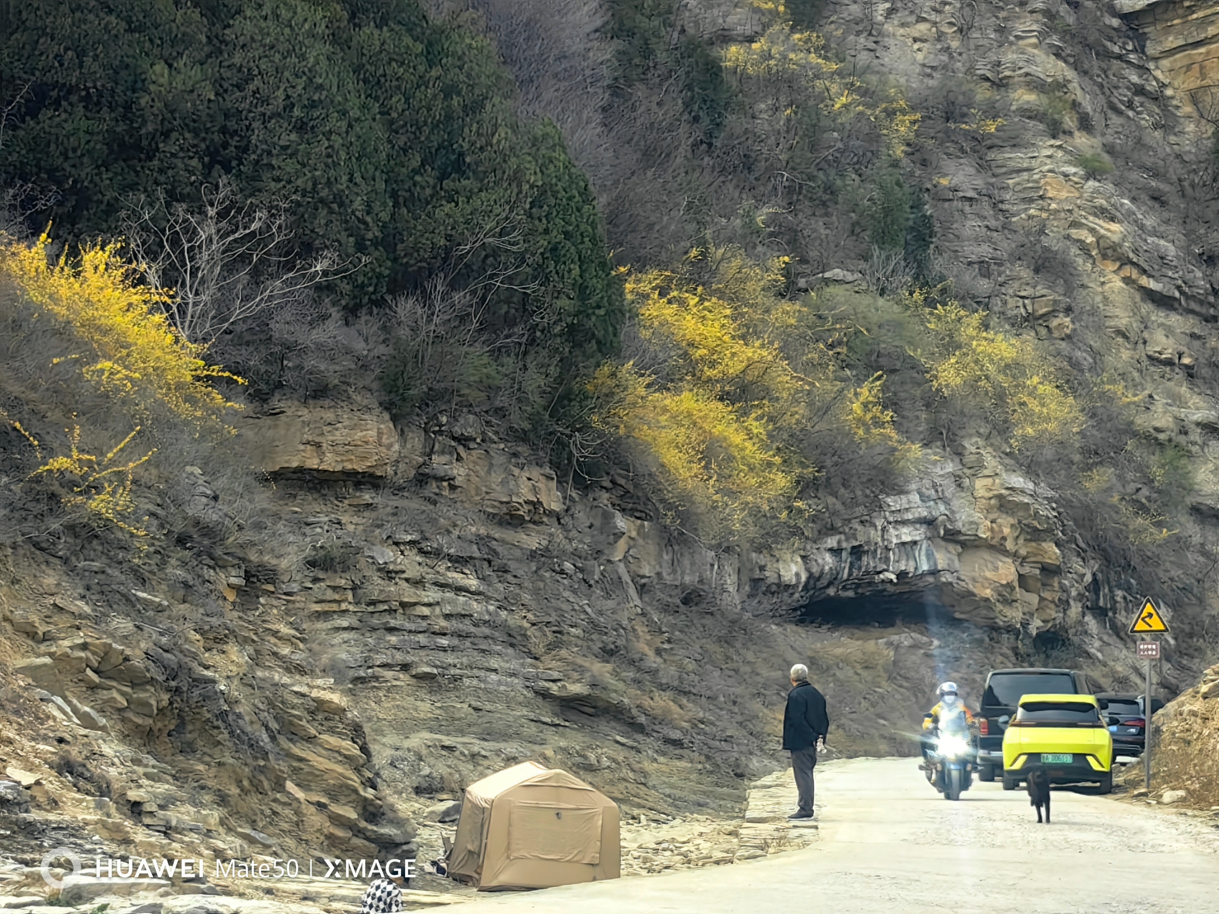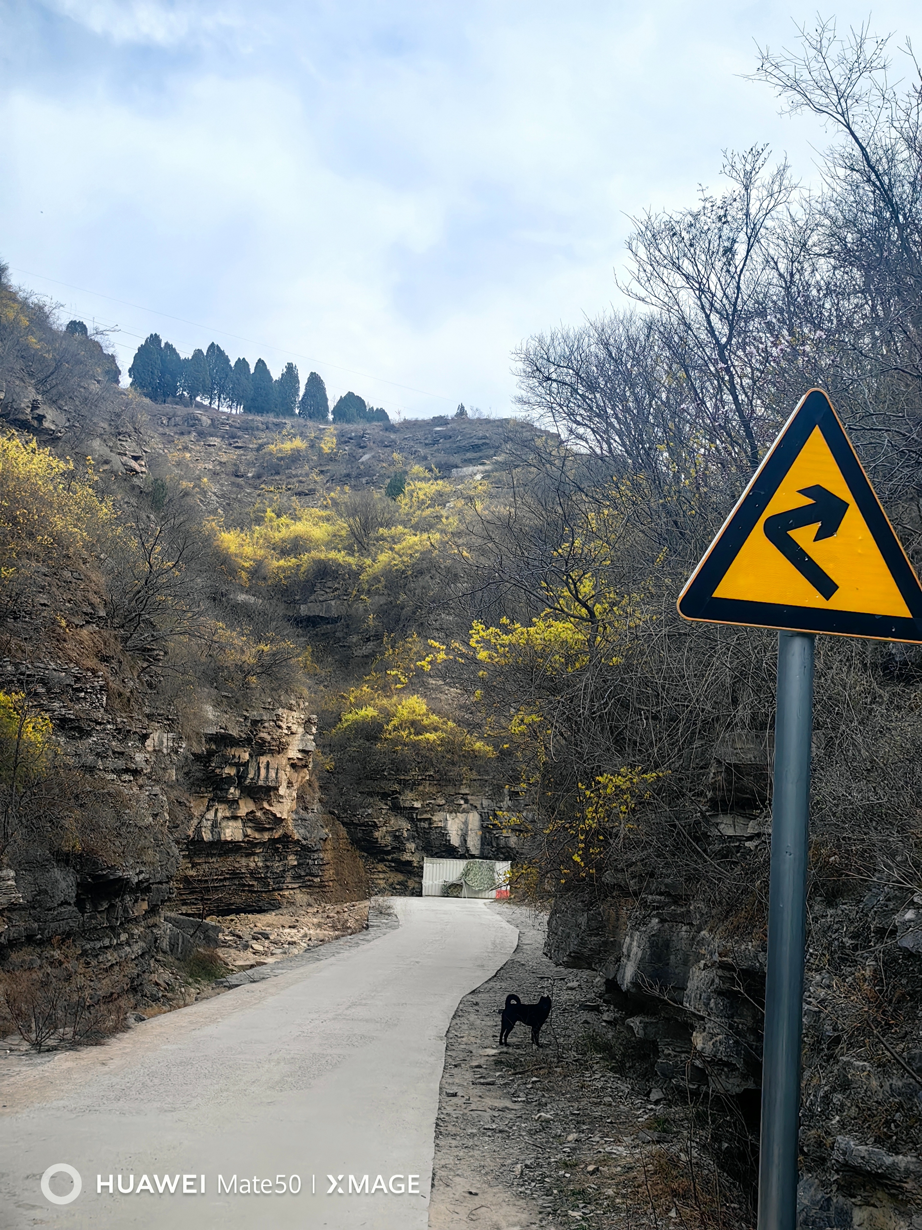 蜿蜒的水泥路在峡谷间穿梭,像是一条通往春天的小径。小黑狗的身影穿梭其间,为静谧的山野添了几分灵动;路边的交通标识、零星的游人与车辆,让这片自然秘境多了几分人间烟火。崖壁下的石洞、石砌的老墙,藏着佛峪沟的旧时光,与漫山春色撞个满怀,一半是山野的辽阔,一半是春日的温柔。