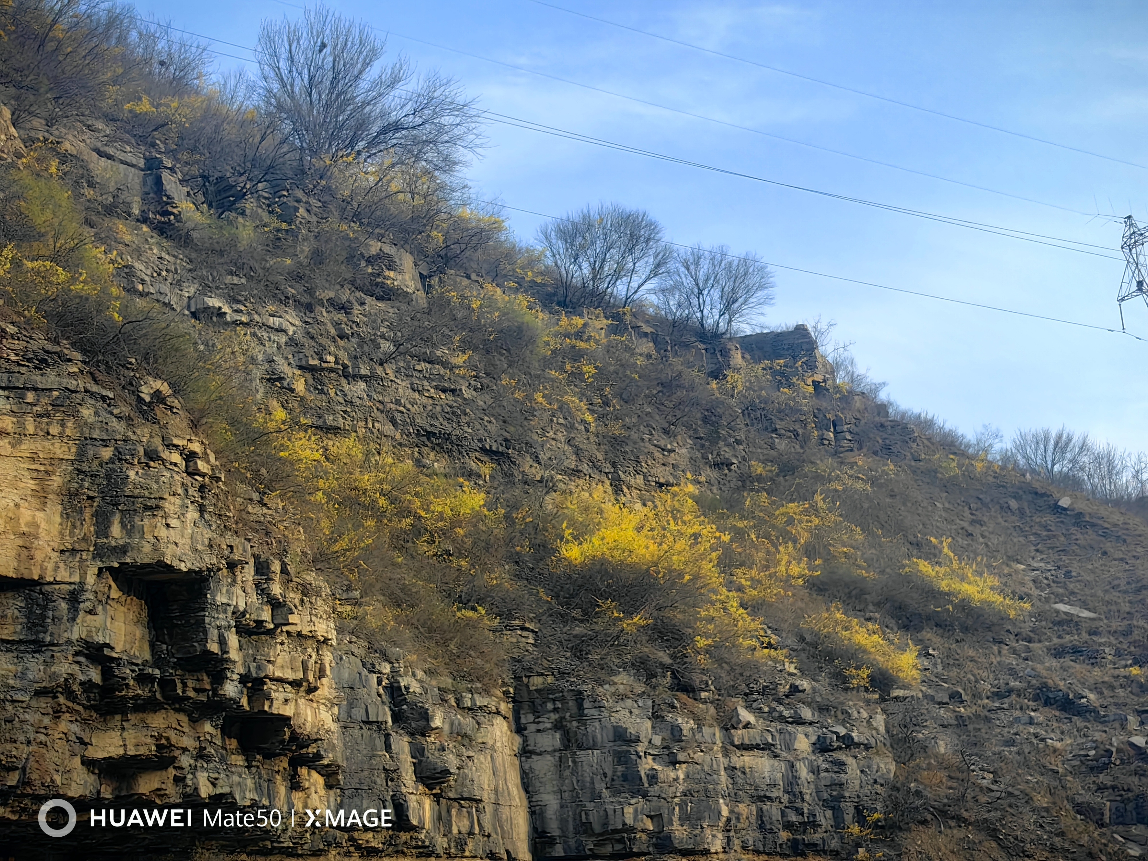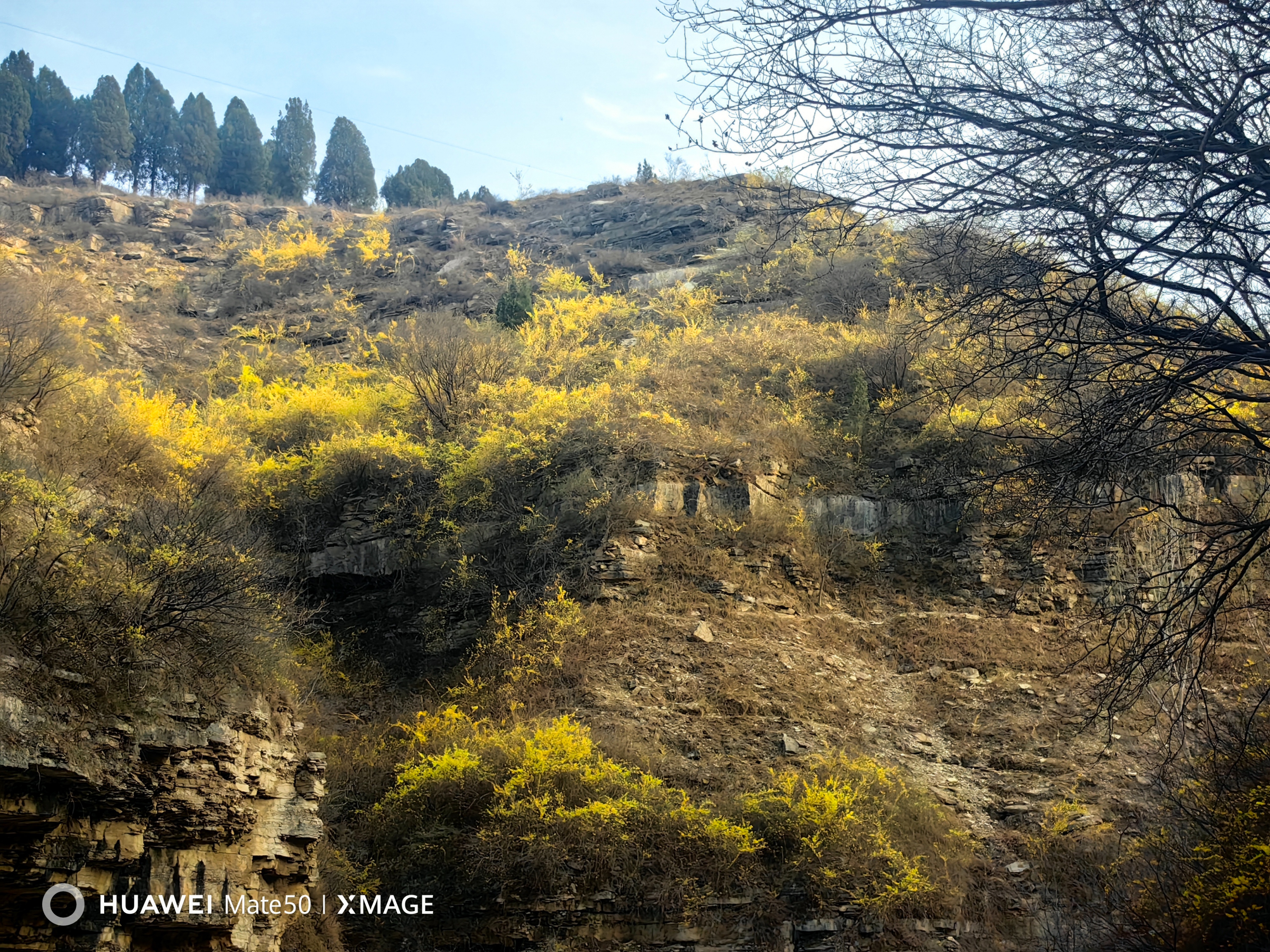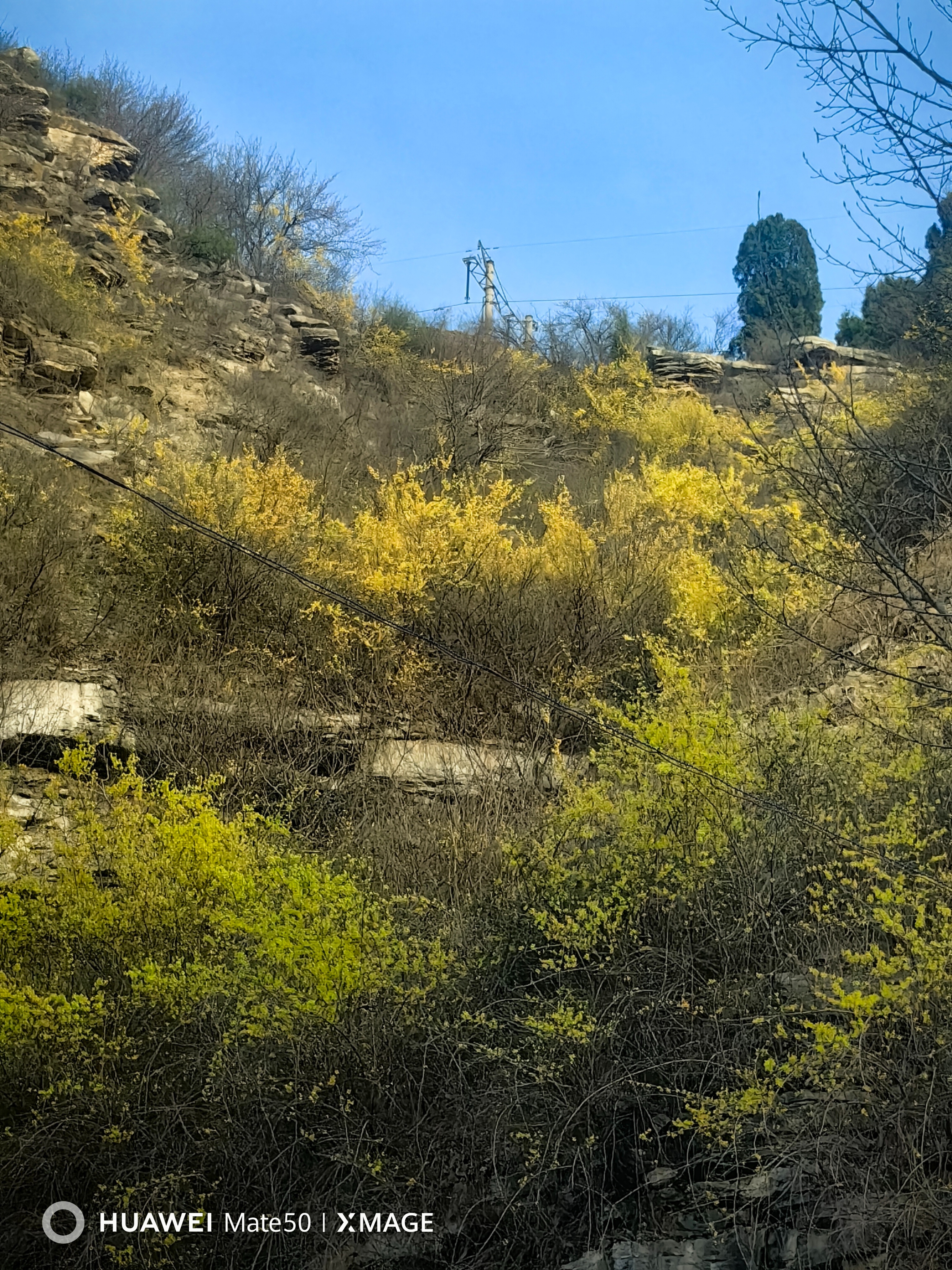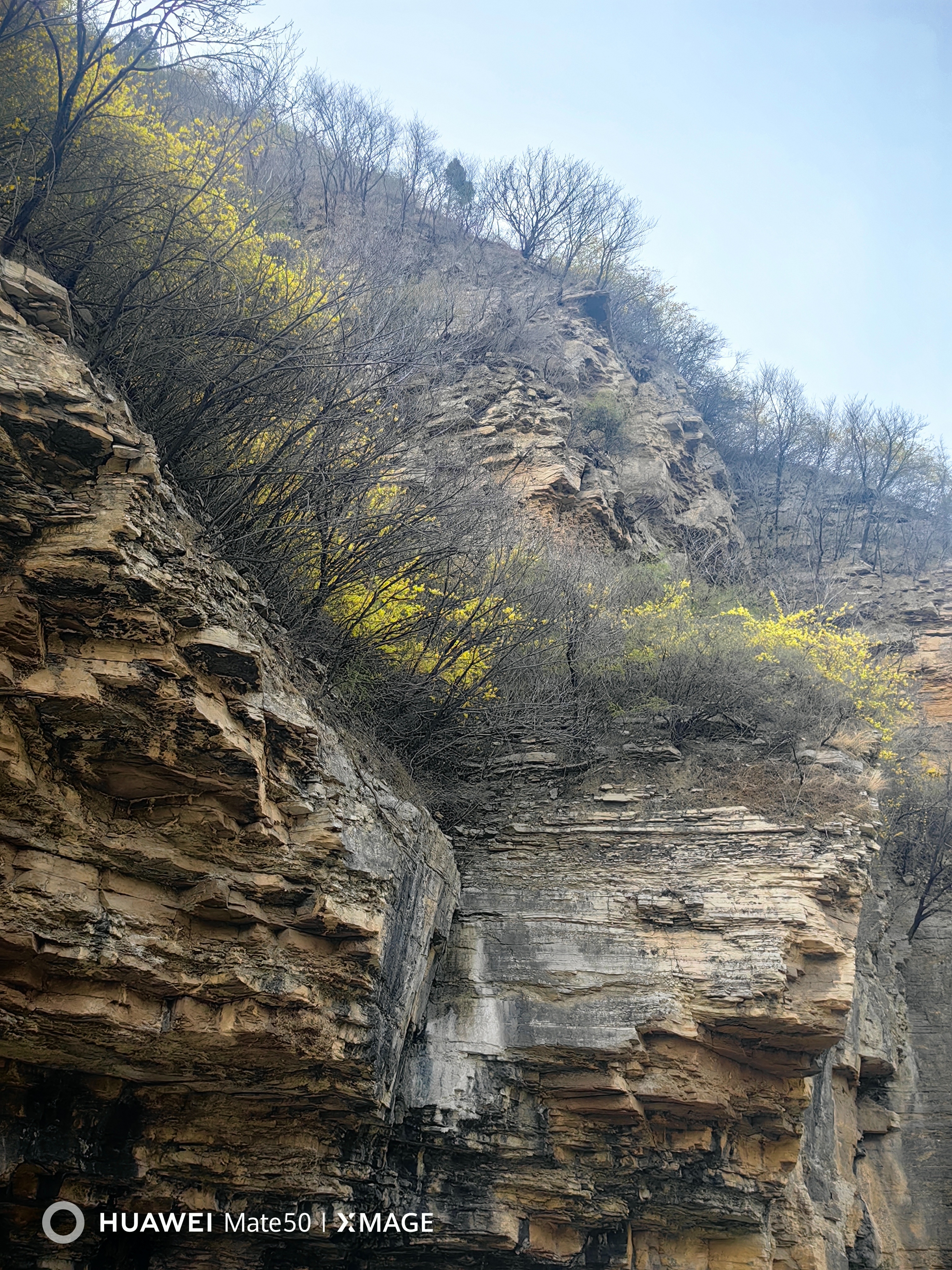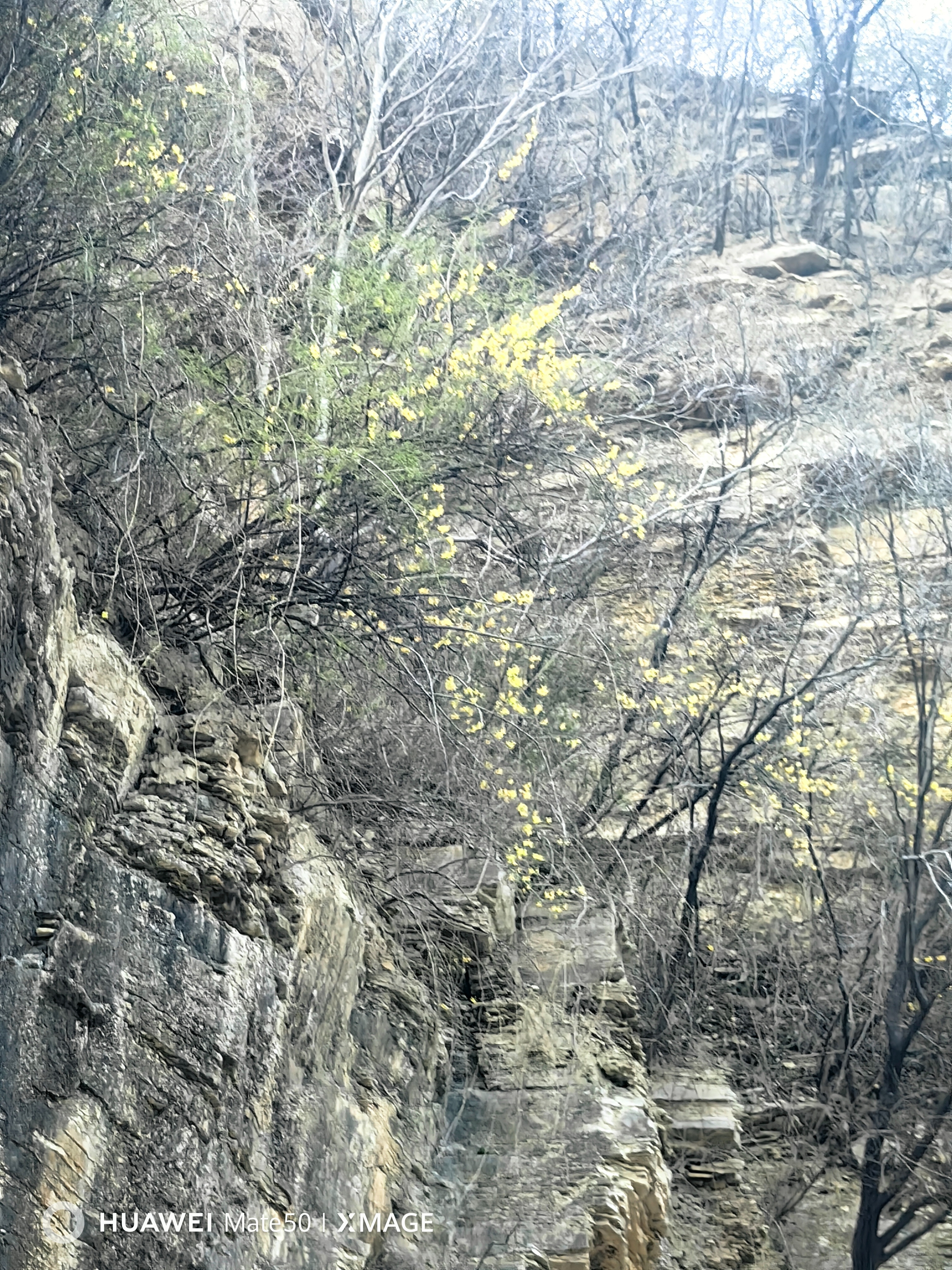层叠的石灰岩崖壁间,连翘花顺着山势肆意盛放,一丛丛、一簇簇,像被春风泼洒的金浪,从谷底漫上山巅,把原本萧瑟的山野晕出满目的生机。苍劲的侧柏在崖顶挺立,为这片金黄添上浓绿的底色;裸露的岩层纹理纵横,刻着岁月的痕迹,与烂漫春花相映,刚柔并济间尽是山野的野趣。