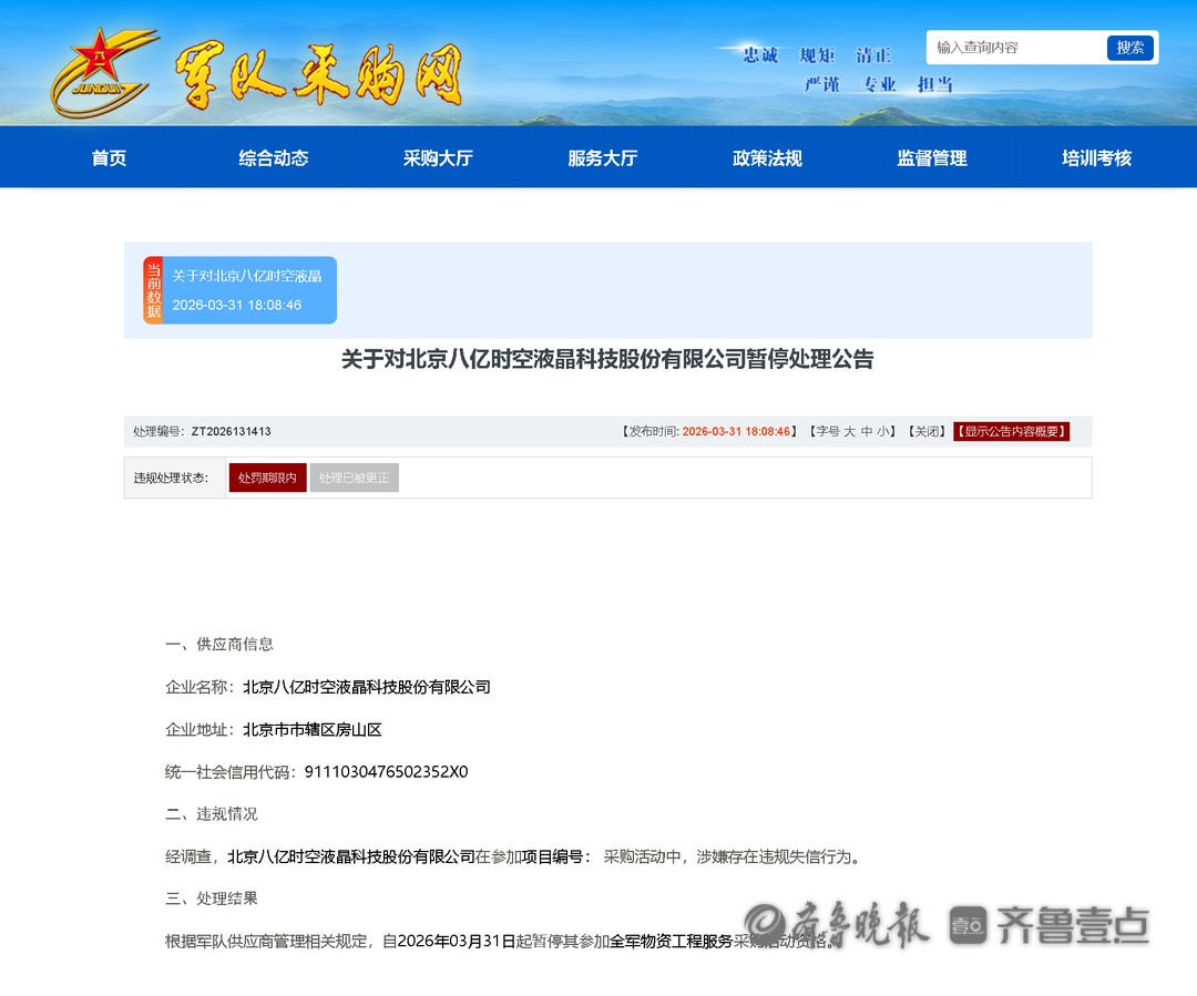 3月31日,军队采购网发布关于对北京八亿时空液晶科技股份有限公司(八亿时空 688181)暂停处理公告。