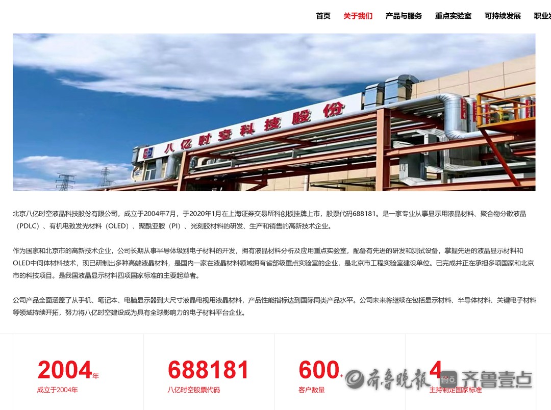 八亿时空成立于2004年7月,于2020年1月在上海证券交易所科创板挂牌上市,股票代码688181。是一家专业从事显示用液晶材料、聚合物分散液晶(PDLC)、有机电致发光材料(OLED)、聚酰亚胺(PI)、光刻胶材料的研发、生产和销售的高新技术企业。