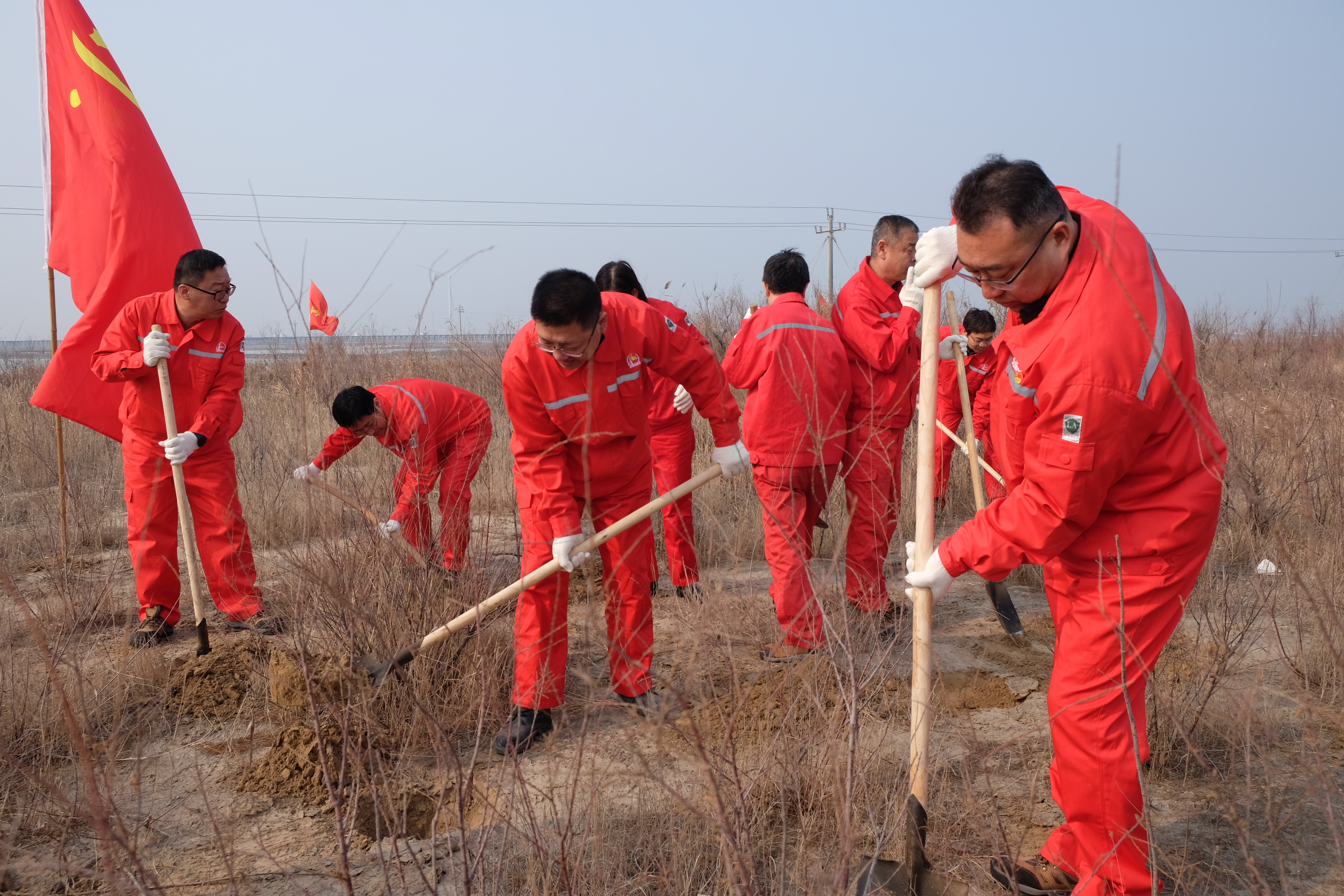 近日,胜利油田孤东采油厂海堤管理站组织干部员工开展海堤植树绿化活动。在植树现场,大家栽树、培土、浇水,干劲十足,一棵棵新栽的红柳苗木迎风挺立,为初春的孤东海堤增添了新的生机和活力。