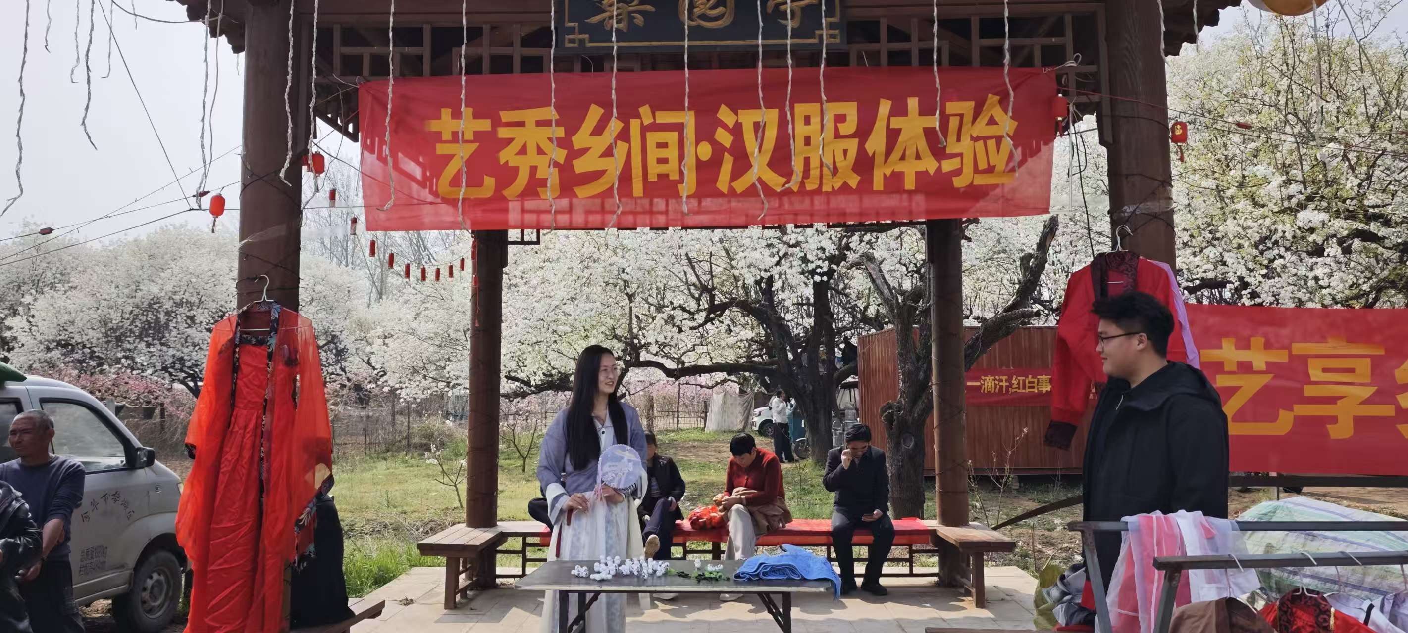 活动现场,文明新风与传统文化交融共促,文旅业态同步升温。一方面通过宣传横幅、主题节目展演等形式,倡导抵制高价彩礼、反对大操大办、厚养薄葬,让移风易俗理念深入人心;另一方面开展二十四节气文化宣传,普及传统节气知识与农耕文化。现场同步开设汉服体验打卡点,鼓励游客身着汉服漫步梨园,形成特色文旅风景线;同时电商直播热闹开场,本土主播实时直播推介,线上线下互动氛围浓厚。