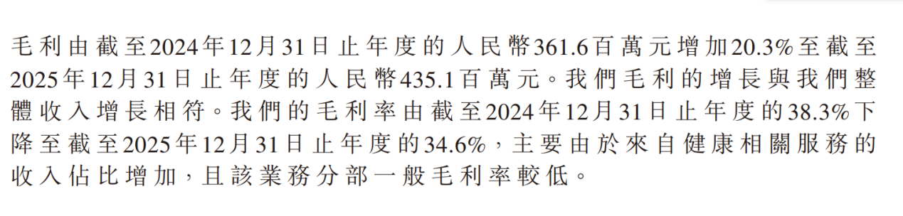 从健康相关服务来看,轻松健康集团的早期疾病筛查相关推广及咨询服务的毛利及毛利率,分别由2024年的0.35亿元及77.0%,下降至2025年的0.33亿元及35.9%。