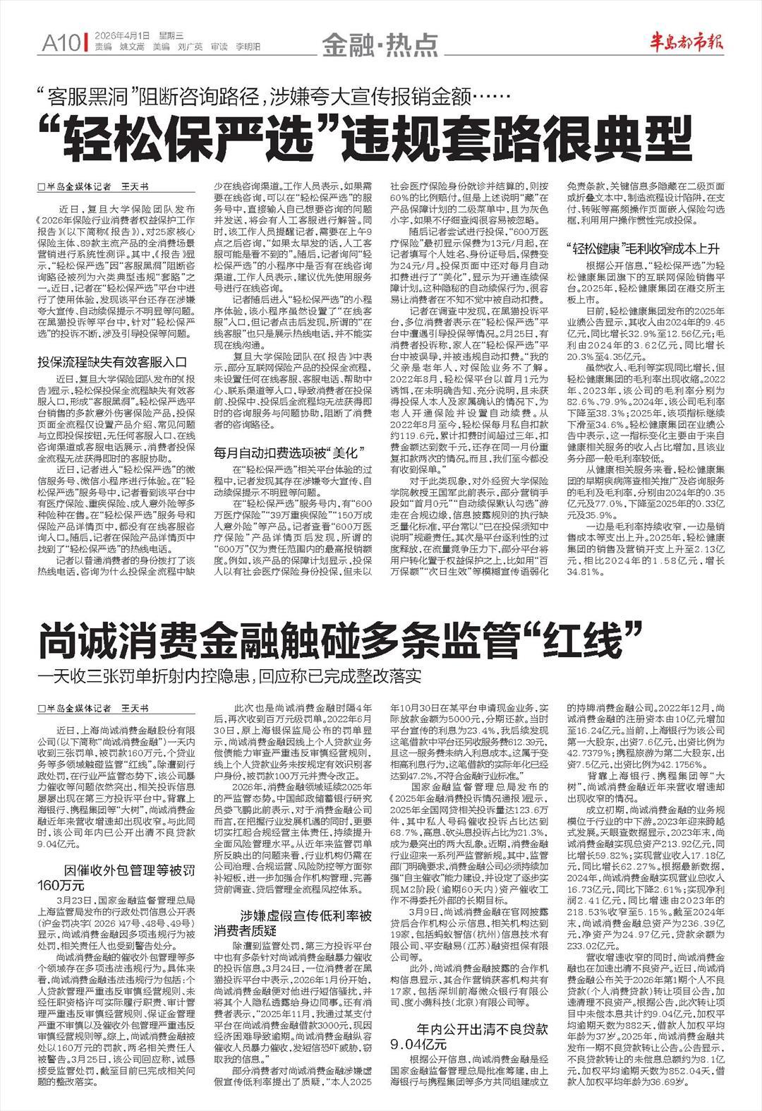 近日,复旦大学保险团队发布《2026年保险行业消费者权益保护工作报告》(以下简称《报告》),对25家核心保险主体、89款主流产品的全消费场景营销进行系统性测评。其中,《报告》显示,“轻松保严选”因“客服黑洞”阻断咨询路径被列为六类典型违规“套路”之一。近日,记者在“轻松保严选”平台中进行了使用体验,发现该平台还存在涉嫌夸大宣传、自动续保提示不明显等问题。在黑猫投诉等平台中,针对“轻松保严选”的投诉不断,涉及引导投保等问题。