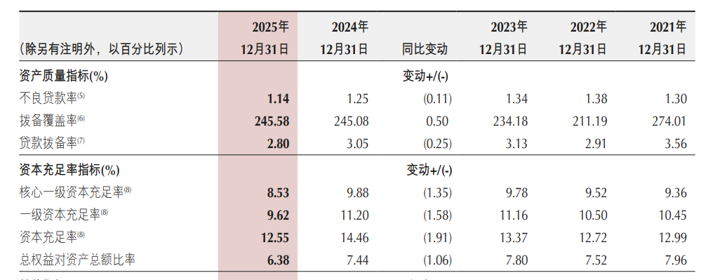 资产规模快速扩张的同时,负债端增速更快,截至2025年末,重庆银行总负债达9677.27亿元,同比增长22.05%,存贷比持续高位运行,流动性管理压力有所上升。资本充足率方面,截至2025年末,重庆银行核心一级资本充足率8.53%,一级资本充足率9.62%,资本充足率12.55%,虽满足监管要求,但较2024年末分别下降1.35、1.58、1.91个百分点,资本补充压力持续存在。对于资本充足率的下滑,重庆银行解释称,“各项业务正常发展,表内外风险加权资产总额均有所增加,在一定程度上降低了各级资本充足率”。