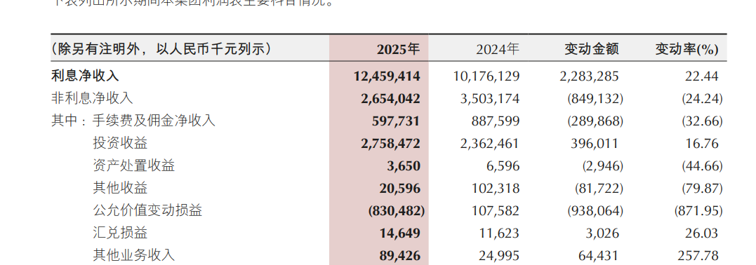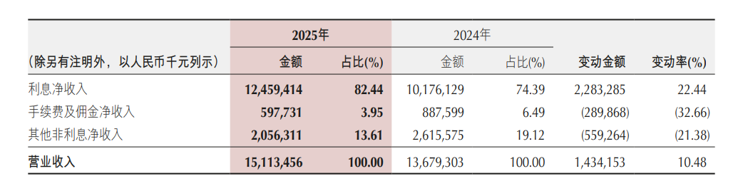 年报数据显示,该行全年利息净收入达124.59亿元,同比增22.44%,占营业收入比重达82.44%,较2024年提升8.3个百分点,成为业绩增长的“独苗”。与之形成鲜明对比的是,非利息净收入26.54亿元,同比跌24.24%。其中,手续费及佣金净收入5.98亿元,较上年减少2.90亿元,降幅32.66%;代理理财业务收入3.44亿元,较上年减少3.35亿元,降幅49.29%。支付结算及代理业务收入2.65亿元,同比增长14.71%,但无力扭转非息收入整体下滑态势。此外,其他非利息收入20.56亿元,同比减少5.59亿元,降幅21.38%;公允价值变动损益亏损8.30亿元,同比降871.95%,在同业中较为突出,成为拖累非息收入的核心因素。全年非利息净收入在营收中占比17.56%,其中手续费及佣金净收入占比仅3.95%,轻资本业务转型严重滞后。