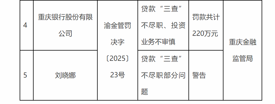监管罚单密集落地,违规类型集中且反复。2025年10月22日,国家金融监督管理总局重庆监管局公布罚单,重庆银行因贷款“三查”不尽职、投资业务不审慎,被罚款220万元,相关责任人被警告。这是该行当年收到的首张百万级罚单。