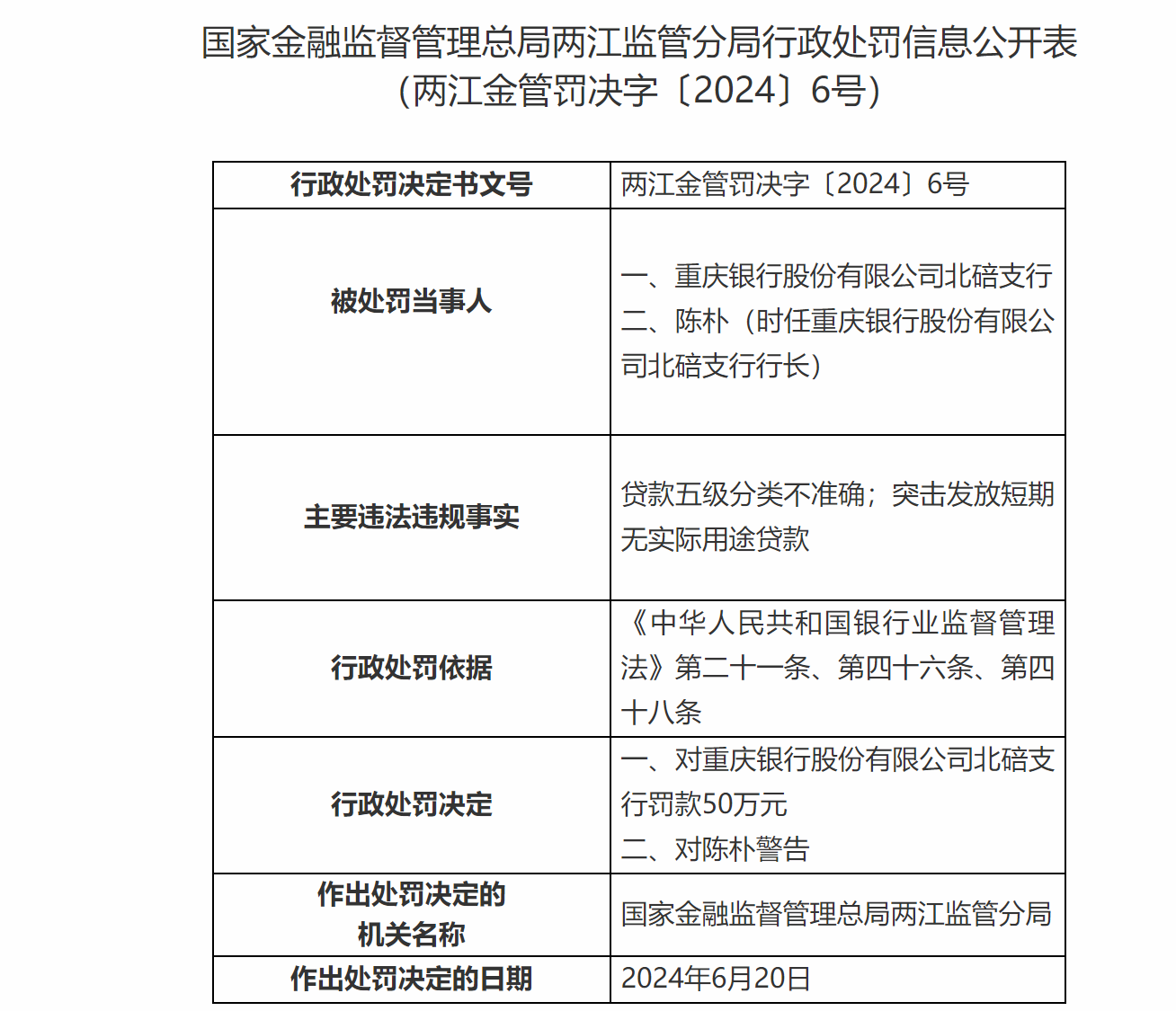 2024年6月,重庆银行因贷款风险分类不准确、资金投向不合规、贷前调查不尽职等问题,被罚款200万元;其北碚支行因贷款五级分类不准确、突击发放无实际用途贷款,被罚款50万元。