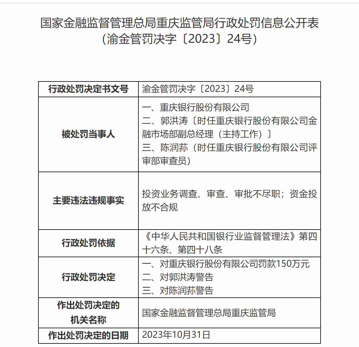 2023年10月,重庆银行因投资业务调查审查审批不尽职、资金投放不合规,被罚款150万元。