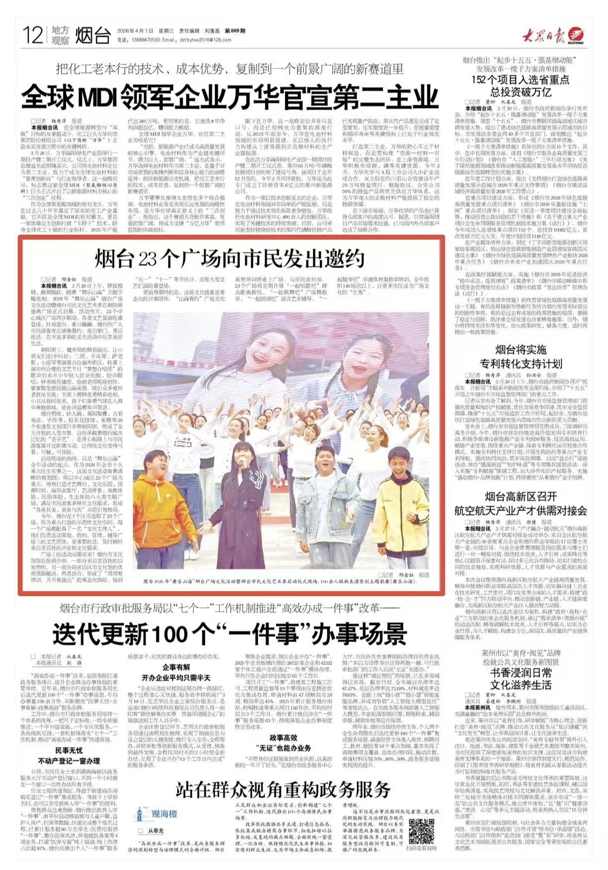 3月29日上午,锣鼓铿锵、醒狮腾跃,随着“舞乐山海”主题字幅亮相,2026年“舞乐山海”烟台广场文化活动暨烟台市民文化艺术季在朝阳街盛典广场正式启幕。活动当天,23个中心城区广场同步联动,各类文艺展演轮番登场、好戏连台。春日融融,烟台向广大市民游客发出诚挚邀约:走出家门,秀出绝活,在丰富多彩的文化活动中乐享美好生活。