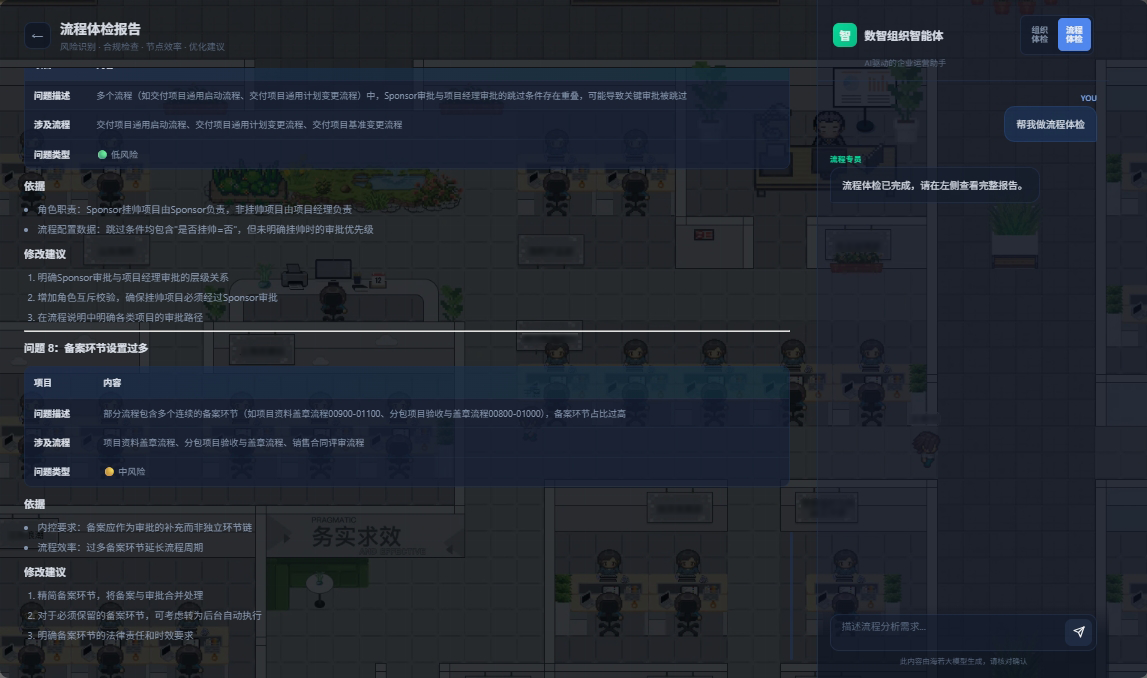 流程“体检”依托流程成熟度、价值链、端到端LTC等典型管理模型,通过对工作全流程数字化复刻与动态模拟,对组织内部流程效率、合规风控、资源投入等进行量化诊断,识别断点、冗余与风险点,输出优化路径,实现流程高效、合规、可落地运转。