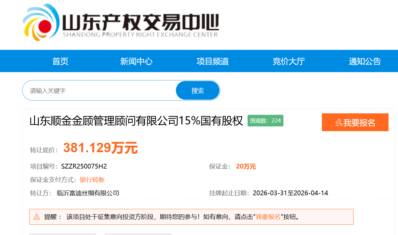 3月31日,山东顺金金顾管理顾问有限公司(下称“金顾管理”)15%国有股在山东产权交易中心挂牌转让,转让底价381.13万元,转让方为临沂富迪丝绸有限公司(下称“富迪丝绸”)。