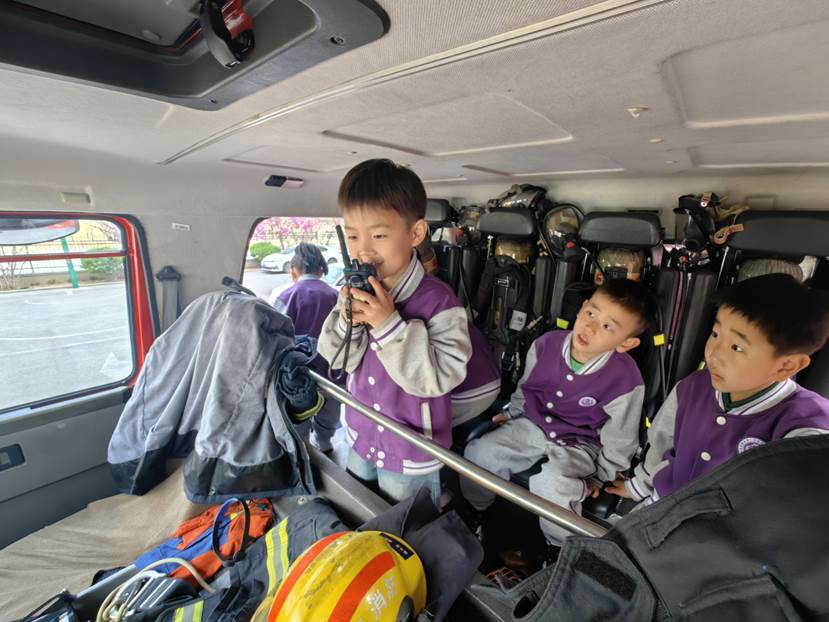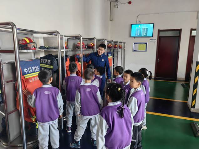 随后,消防员带领孩子们走进消防站内,参观了消防员的执勤装备区。整齐划一的物品摆放、井然有序的消防服,让孩子们直观感受到消防员严谨扎实的工作作风。消防员现场演示了快速穿戴消防服的过程,并邀请孩子们近距离观察,让大家深刻体会到消防员出警时的分秒必争与责任担当。