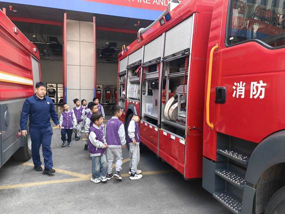 活动伊始,消防员叔叔热情地迎接了孩子们,并带领大家逐一参观消防车辆和救援装备。在消防车前,消防员详细讲解了不同类型消防车的功能与用途,打开车厢向孩子们展示水带、水枪、破拆工具等专业设备,耐心解答大家的好奇提问。孩子们围在一旁,认真观察、仔细聆听,不时发出阵阵惊叹,还亲手触摸了消防水带和灭火器,直观感受消防装备的“威力”。