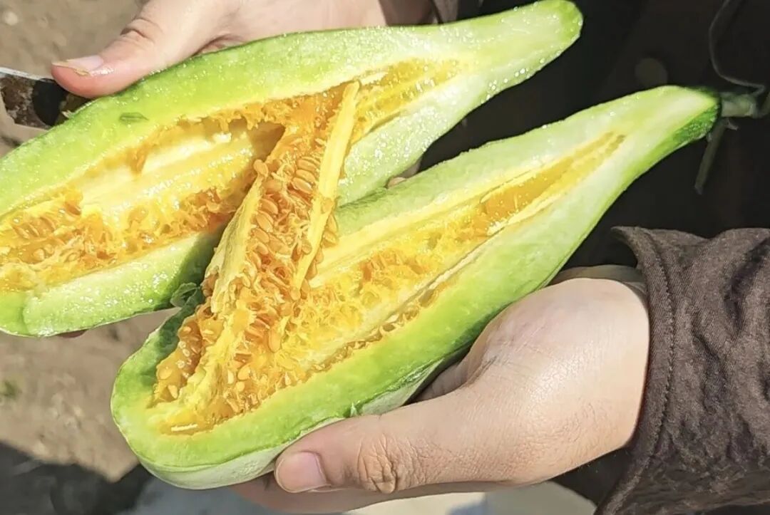 羊角蜜,果皮浅绿色带纵向条纹,两端大小比较平均,口感更甜、更面,瓤是金黄色的,咬起来甚至有点拉丝。
