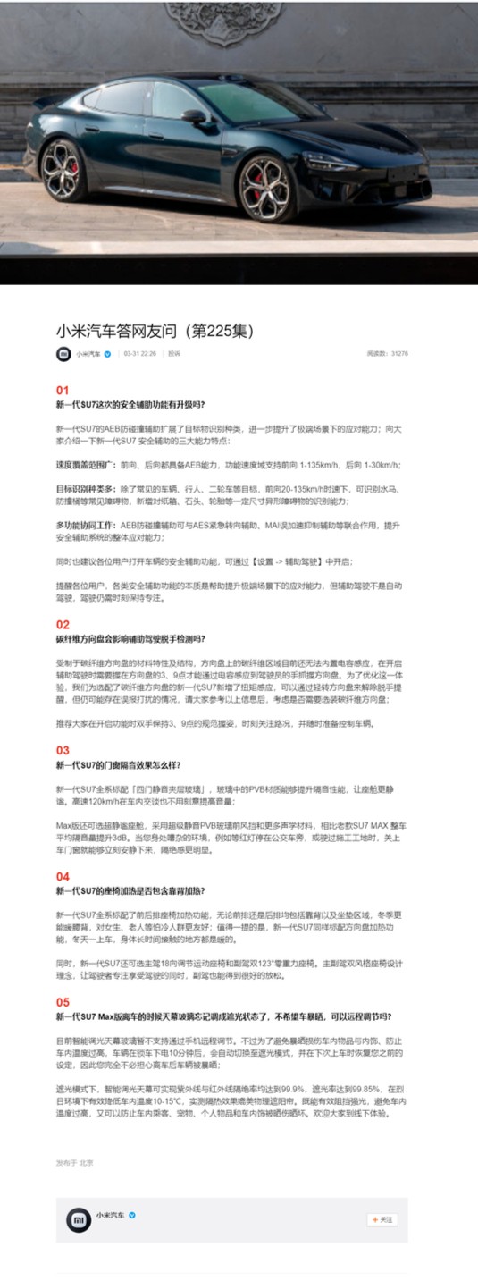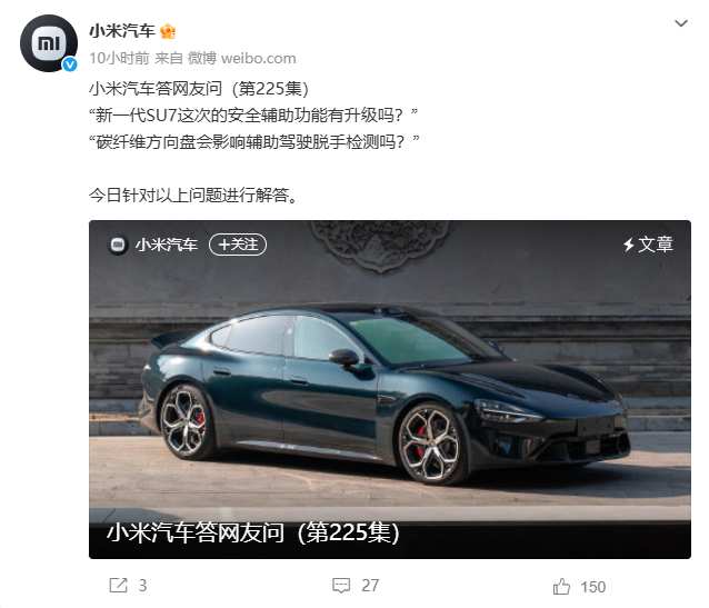 4月1日,在最新一期答网友问中,小米汽车针对新一代 SU7 这次的安全辅助功能是否有升级、碳纤维方向盘是否会影响辅助驾驶脱手检测等问题进行了解答。