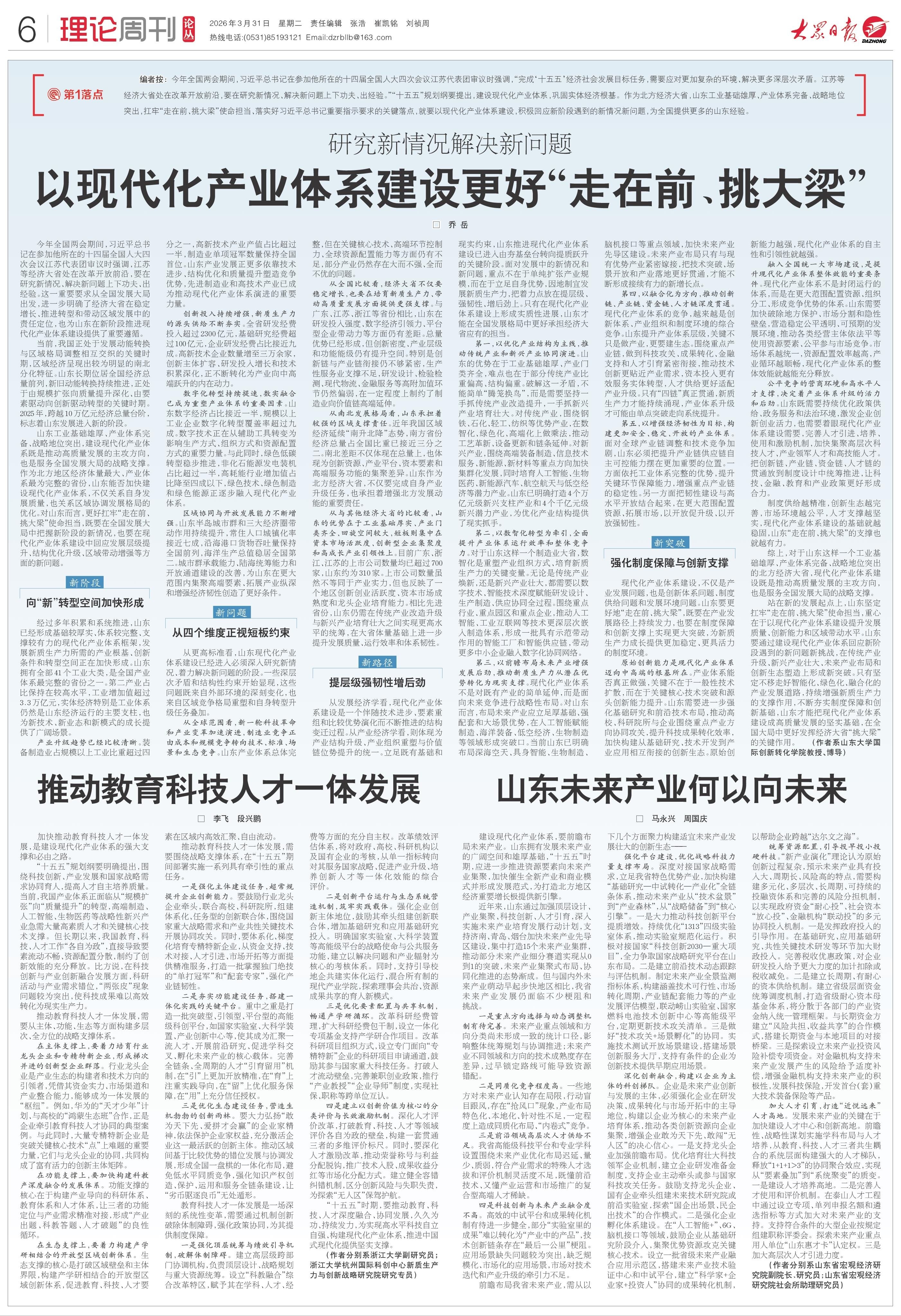 站在新的发展起点上,山东坚定扛牢“走在前、挑大梁”使命担当,重心在于以现代化产业体系建设提升发展质量、创新能力和区域带动水平。山东要通过建设现代化产业体系回应新阶段遇到的新问题新挑战,在传统产业升级、新兴产业壮大、未来产业布局和创新生态塑造上形成新突破。只有坚定不移走好智能化、绿色化、融合化的产业发展道路,持续增强新质生产力的支撑作用,不断夯实制度保障和创新基础,山东才能把现代化产业体系建设成高质量发展的坚实基础,在全国大局中更好发挥经济大省“挑大梁”的关键作用。