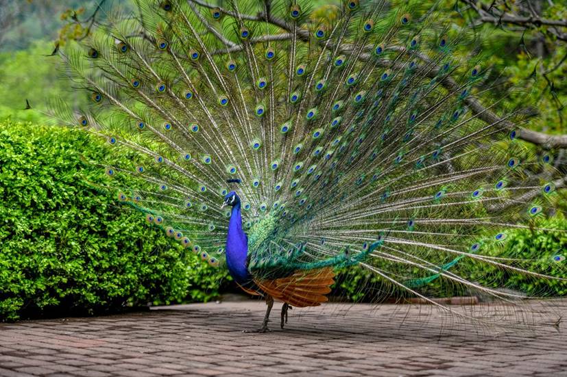 现美人梅,榆叶梅正值盛花期,粉紫繁花缀满枝头,暗香浮动;郁金香也已含苞待放,满园春色次第上新。天趣苑里孔雀时而开屏展羽,与繁花相映成趣,灵动添色。