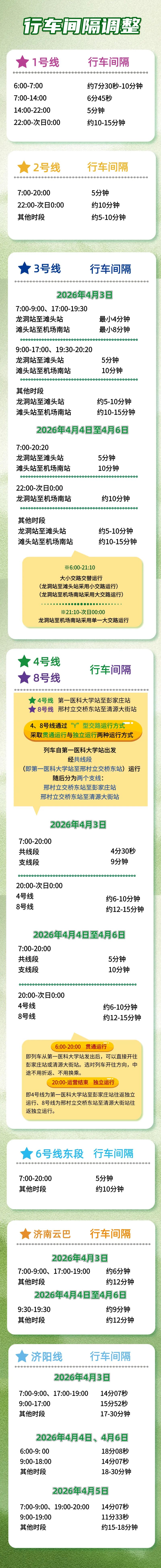 清明假期将至,为满足市民乘客出行需求,济南轨道交通将在4月3日至4月6日,延长运营服务时间。清明假期期间,将有两场体育赛事在济南举办。4月4日中超联赛(山东泰山VS大连英博海发),4月6日CBA赛事(山东高速VS广东东阳光),济南轨道交通集团将提前配置备车、灵活调整运力,为市民乘客提供便捷、高效的出行体验。(大众新闻记者刘飞跃)