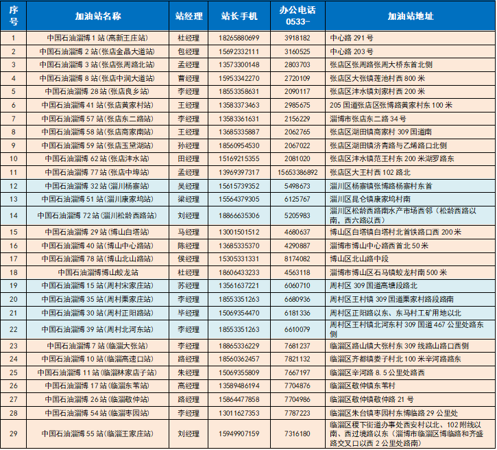 6.如有疑问,请与中国石油淄博分公司刘经理联系,手机号18766936768或咨询淄博地区各中国石油加油站经理(联系方式见下表)。