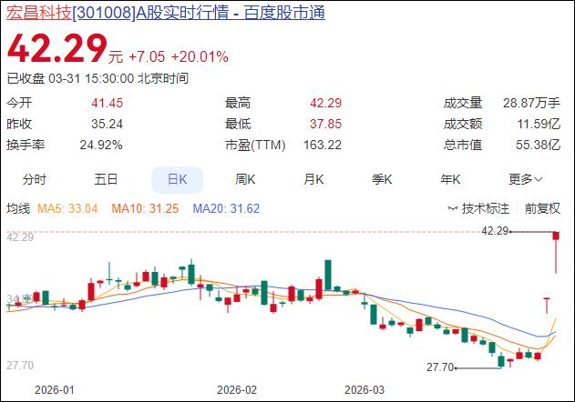 3月31日,宏昌科技发布异动公告,公司股票在2026年03月30日和31日连续2个交易日,收盘价格涨幅偏离值累计达到46.58%。