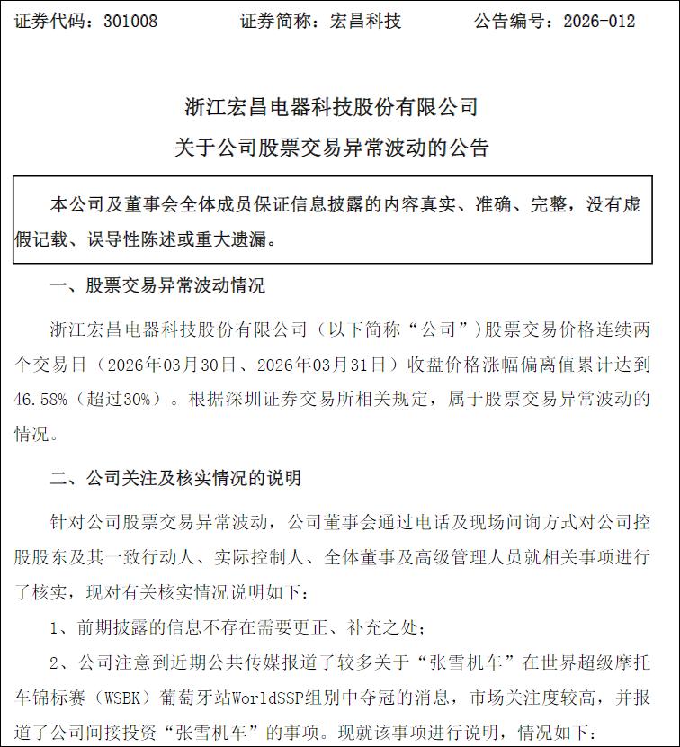 搭上“张雪机车”,宏昌科技“二连板”后紧急发声