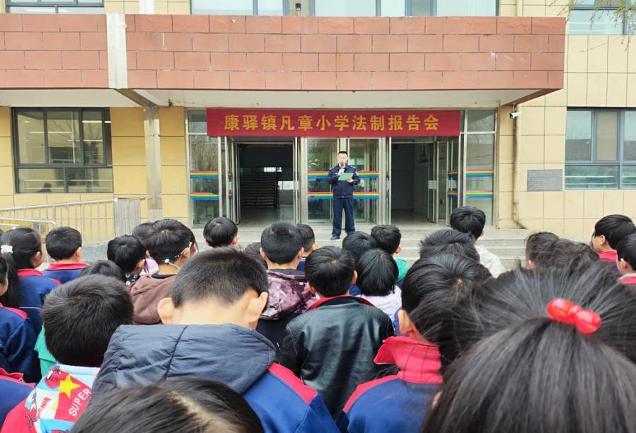 近日,汶上县康驿镇凡章小学举行2026年春季法治报告会。康驿镇派出所姜逸飞和司法所辛衍兆全体师生作法治宣讲。