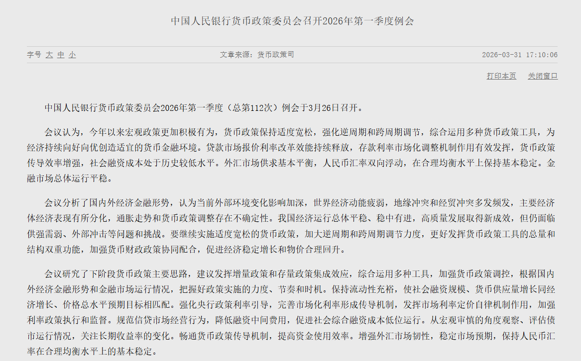 3月31日,据中国人民银行(下称“央行”)官网,央行货币政策委员会2026年第一季度例会于3月26日召开。