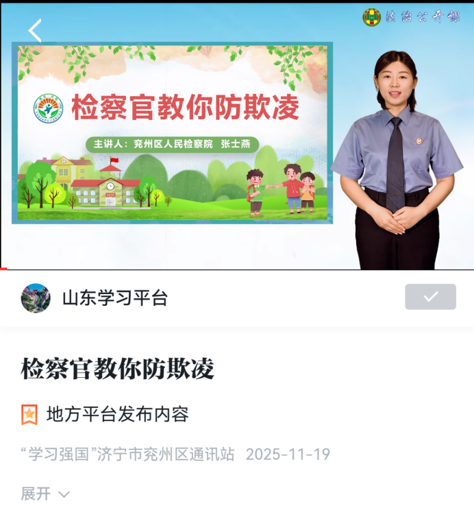 《条例》以专章强调预防犯罪的教育,明确政府、社会、学校、司法在未成年人法治教育中的作用。从根本上降低未成年人违法犯罪率,需要坚持预防为先。济宁兖州区院深入践行“预防就是保护,惩治也是挽救”的理念,常态化开展法治宣讲活动,1名干警两次入选山东省第二届、第三届“法治进校园全省巡讲团”成员并入选全省检察机关未成年人检察法治宣讲类人才库,参与研发的课程被评为全省检察机关第三届“法治进校园”精品课程。持续推进检察官担任法治副校长工作,建立以定期法治宣讲为常态,以“点单预约式”法治宣讲为补充的法治进校园机制,针对不同年龄段学生特点,围绕预防性侵、校园欺凌、网络犯罪、电信诈骗等热点问题,创新普法方法,采用法治微电影、互动问答、小游戏等青少年喜闻乐见的形式,提升了普法实效性。同时,为实现法治教育资源效益最大化,兖州区院联合区法学会打造《预防不良行为,成就美好人生》、《检察官教你防欺凌》两堂精品视频课,通过教育部门统一推送至全区各学校,并上线了学习强国平台,让法治教育能够突破时空限制,抵达更多未成年人的面前。