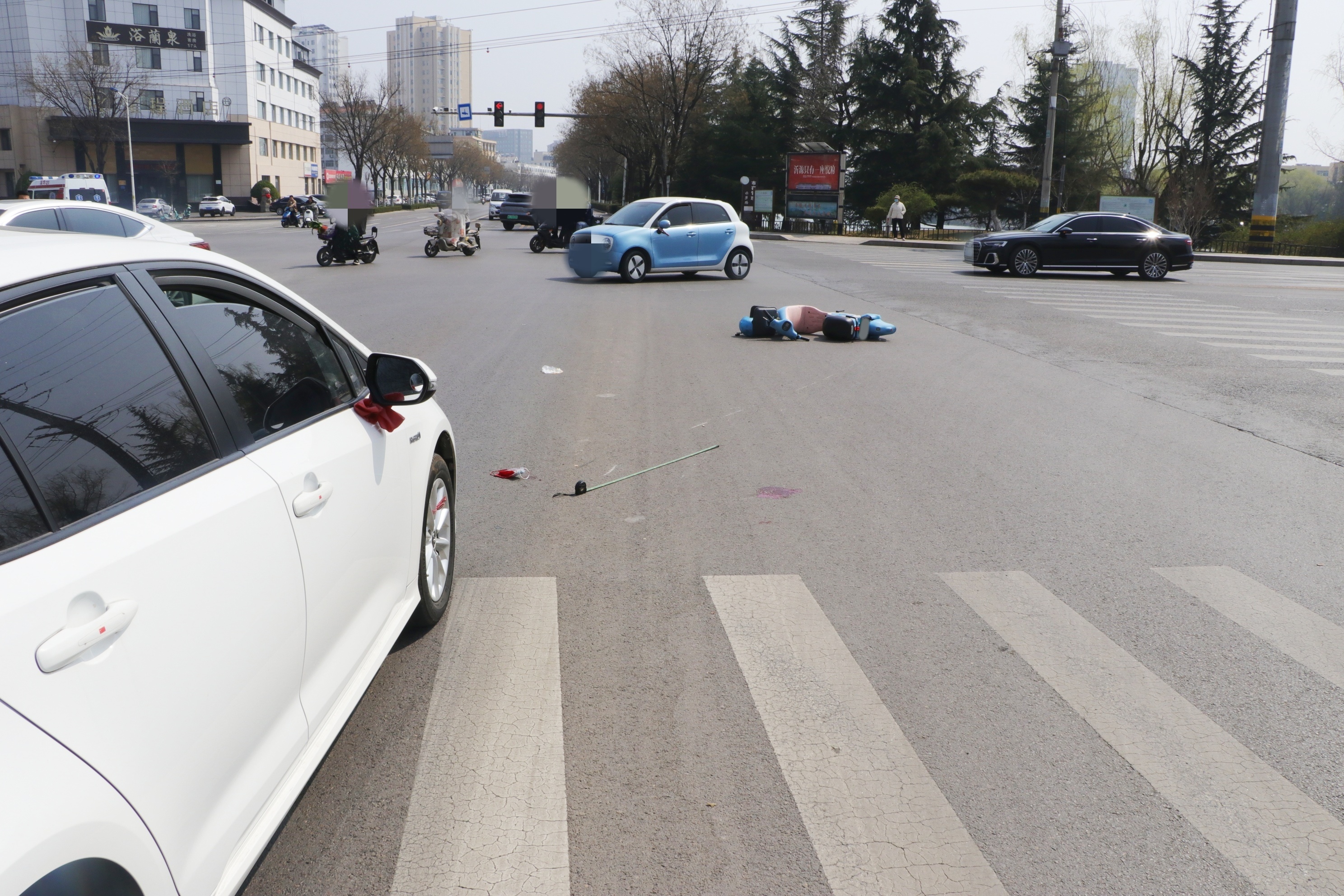3月25日12时56分,在沂源县鲁山路与螳螂河东路路口,一辆电动车由东向西横过公路,因闯红灯与由北向南行驶的小型汽车发生碰撞,造成车辆受损,电动车驾驶人受伤。电动车驾驶人因未正确佩戴安全头盔,发生事故时头部着地,导致重伤需进行手术治疗,暂无生命危险。