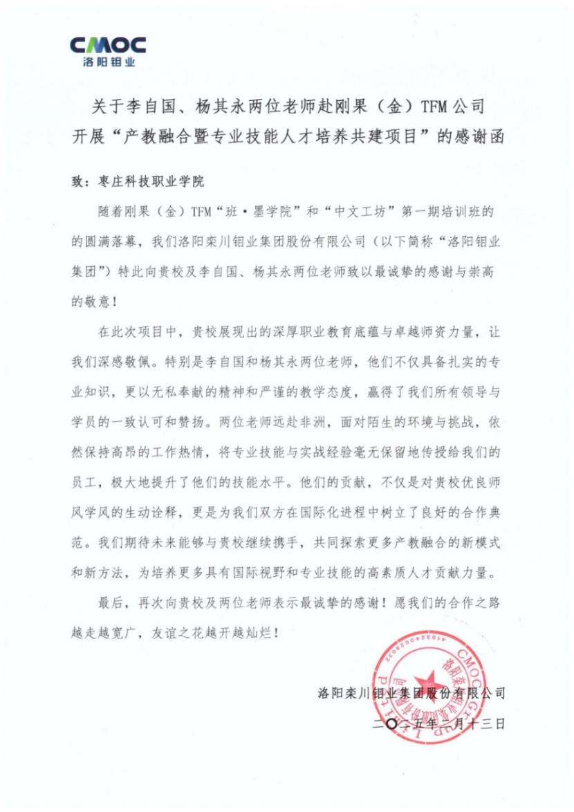 洛阳钼业集团发来的感谢函