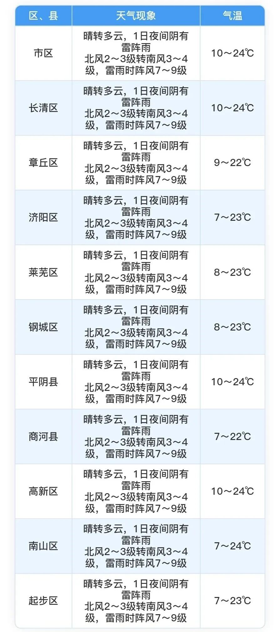 晴转多云,1日夜间阴有雷阵雨,降水概率80%,北风2~3级转南风3~4级,雷雨时阵风7~9级,最低气温市区10℃左右,其他区县7~10℃,最高气温24℃左右。