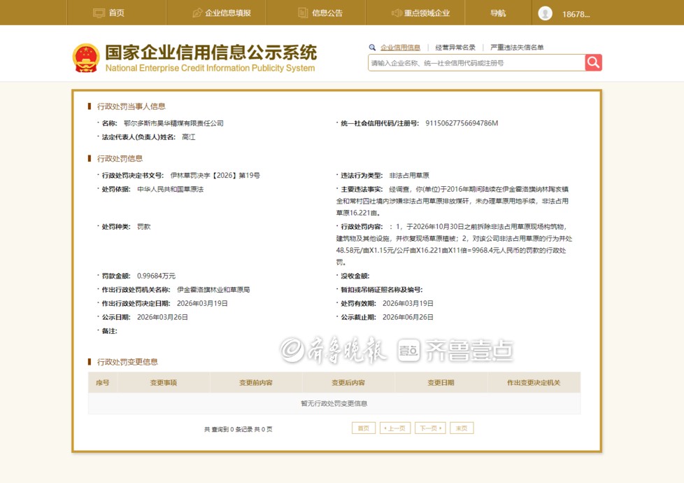 依据《中华人民共和国草原法》相关规定,伊金霍洛旗林业和草原局作出如下行政处罚:责令该企业于2026年10月30日之前,拆除非法占用草原现场的构筑物、建筑物及其他设施,并恢复草原植被;对该企业非法占用草原的行为处以罚款9968.4元人民币。本次行政处罚决定日期为2026年3月19日,公示截止期为2026年6月26日。