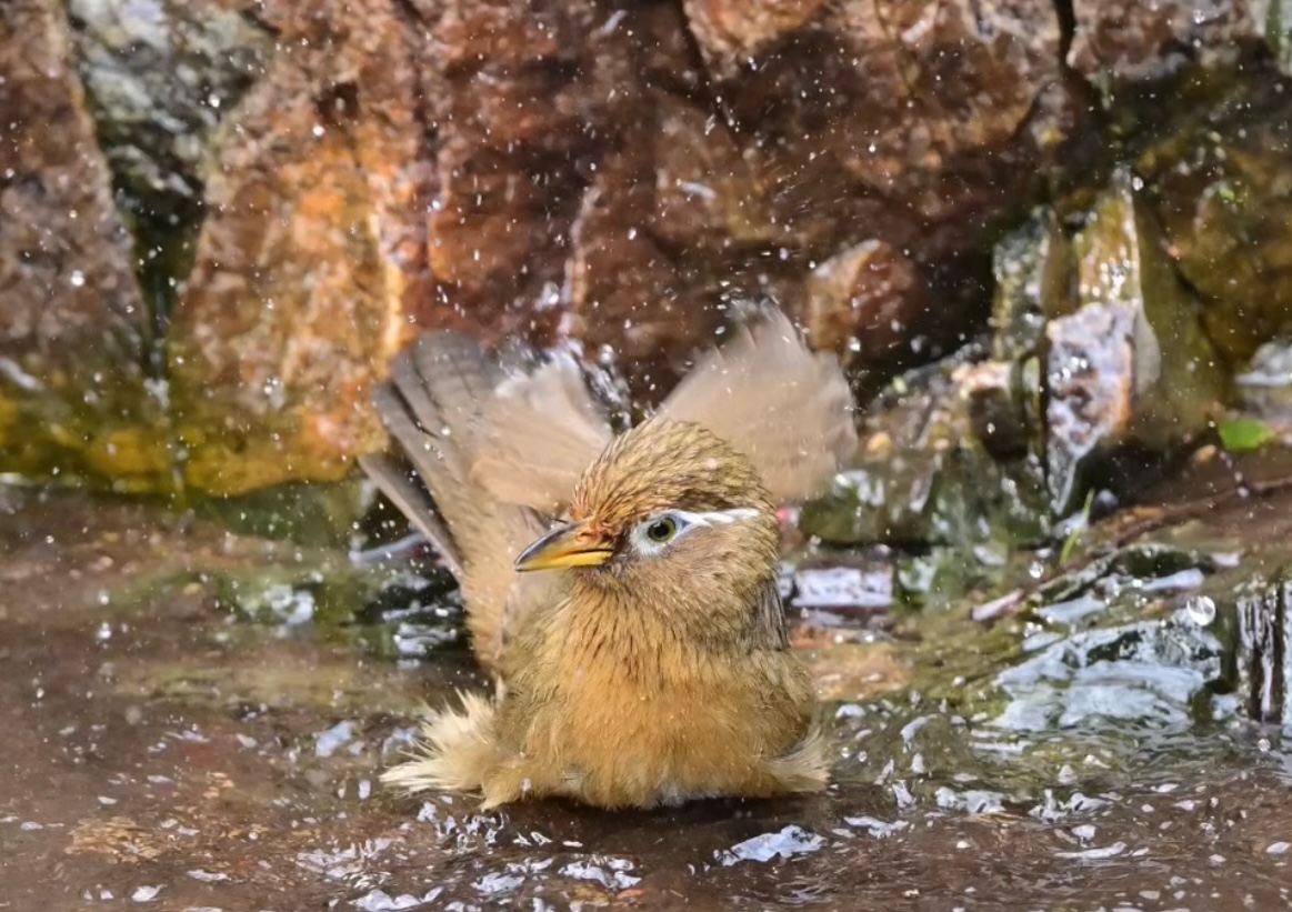 而在崂山的溪涧旁,另一番热闹景象正在上演:一只画眉鸟正尽情戏水。清澈的溪水中,它扑扇着翅膀,溅起串串水花,蓬松的羽毛沾满水珠,却丝毫不减灵动。画眉鸟通体棕褐,眼周标志性的白色眉纹如同画上去一般,辨识度拉满,它们不仅是“歌唱高手”,更是戏水爱好者,春日溪涧成了它们嬉戏的乐园。此次画眉在崂山现身,也印证了当地生态环境的持续向好。
